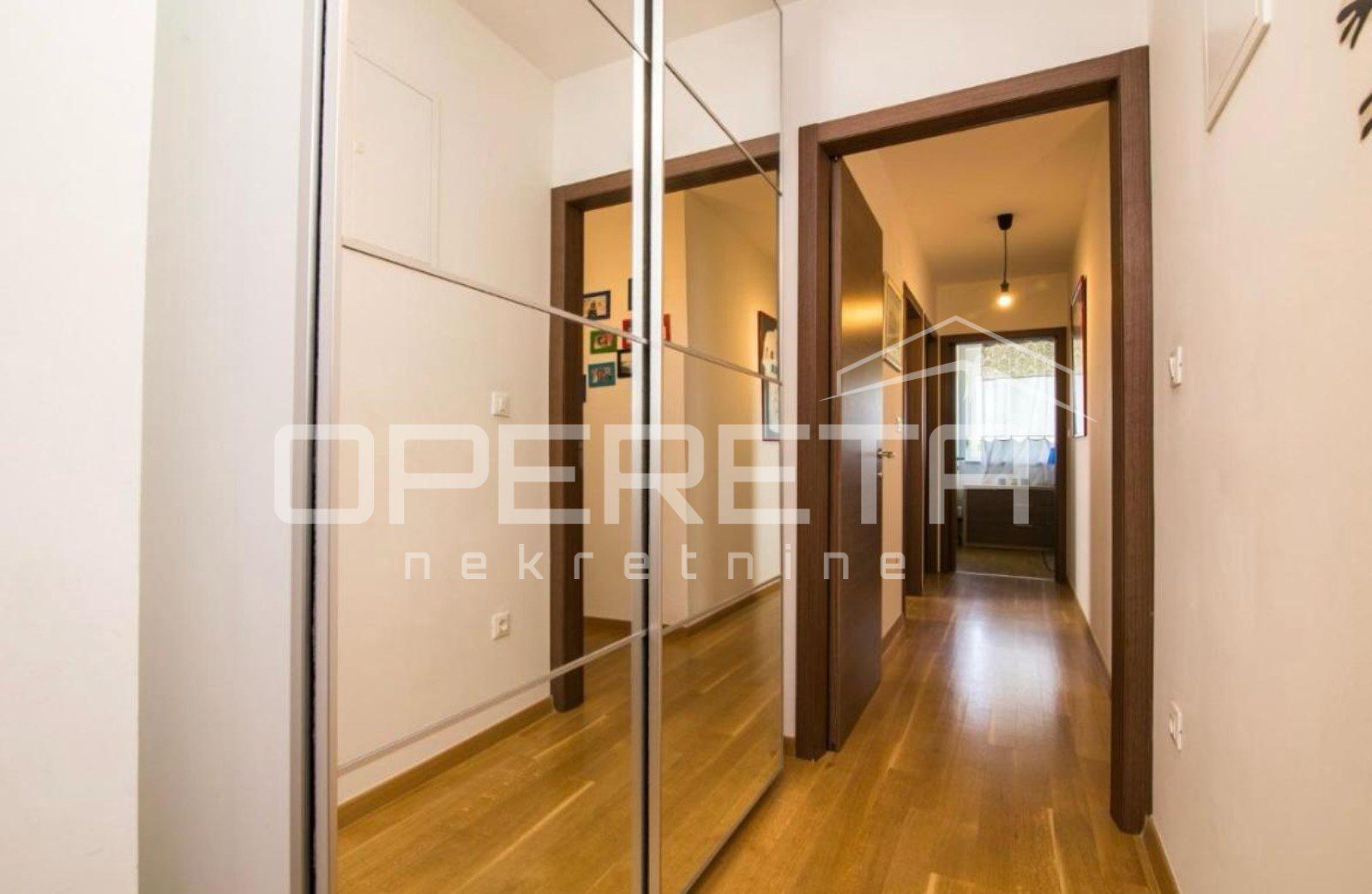 Raspored uključuje ulazni hodnik, tri spavaće sobe, kupaonicu, dodatni wc te prostran dnevni boravak s kuhinjom i blagovaonicom, iz kojeg se kroz veliku staklenu stijenu izlazi na natkrivenu terasu i vlastiti vrt površine 100 m2. Također, stanu pripada i spremište u prizemlju zgrade te jedno parkirno mjesto.