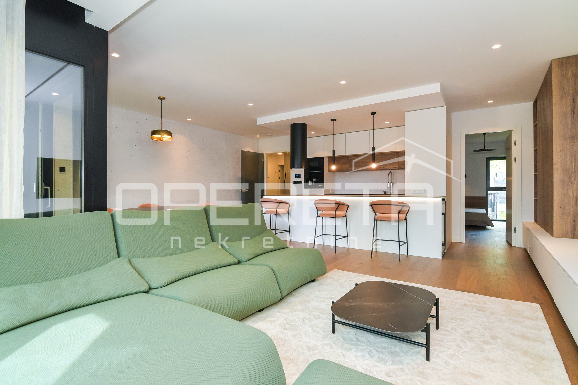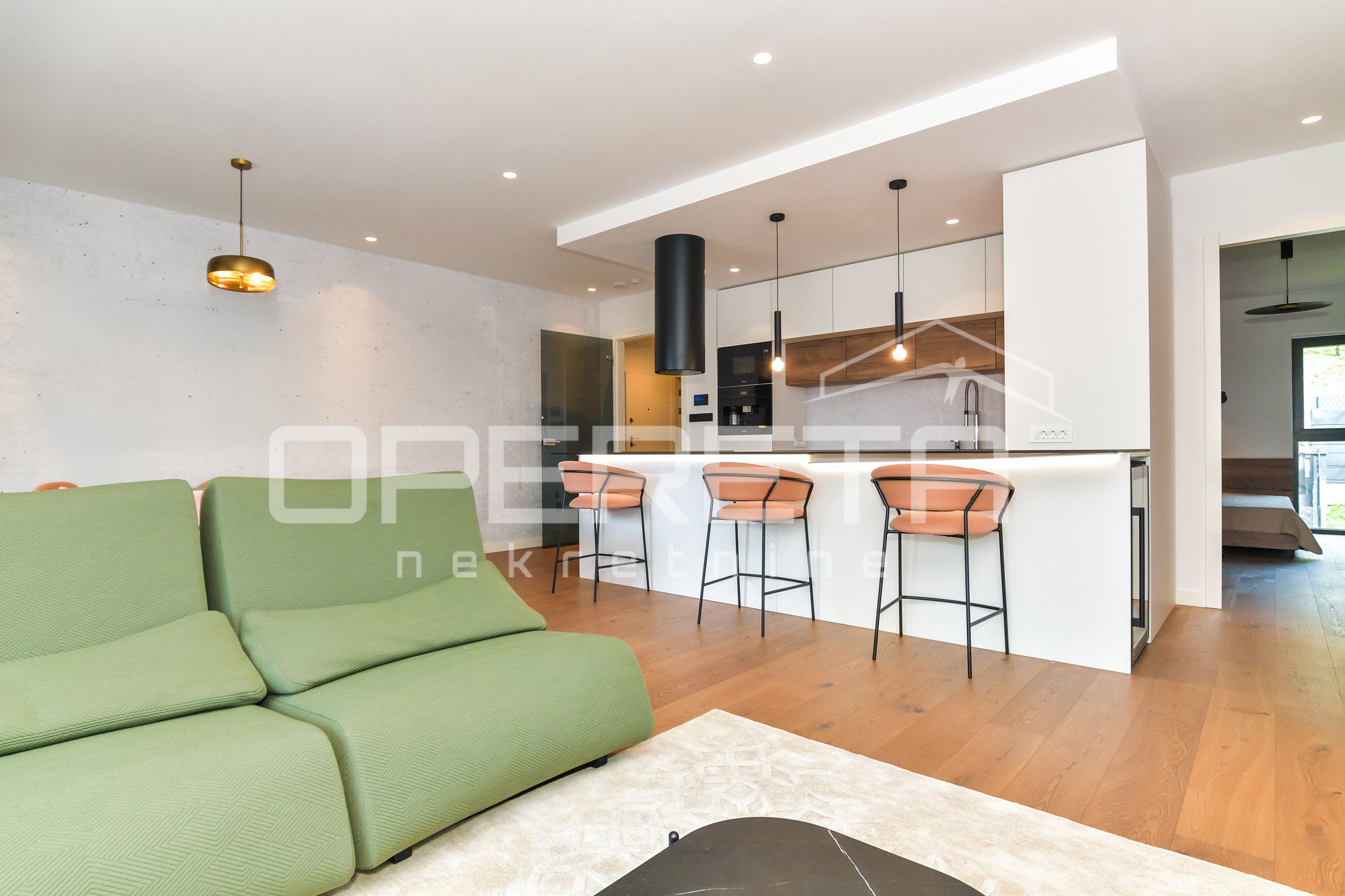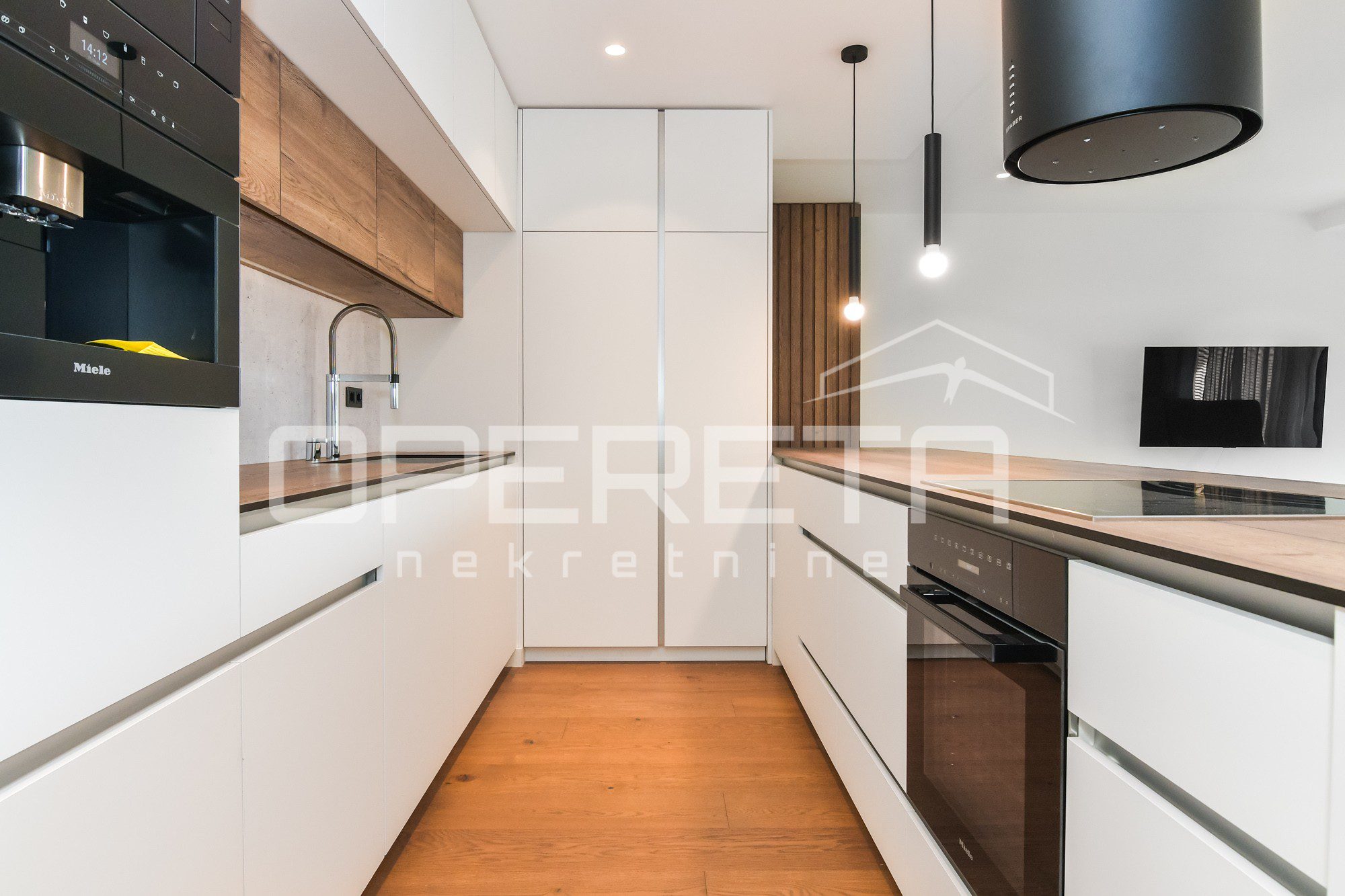 U stanu su korišteni najkvalitetniji materijali, prvoklasna keramika, ugrađena je stolarija po mjeri, Miele kuhinjski uređaji te perilica i sušilica rublja, a opremljen je dizajnerskim namještajem poznatih brendova.