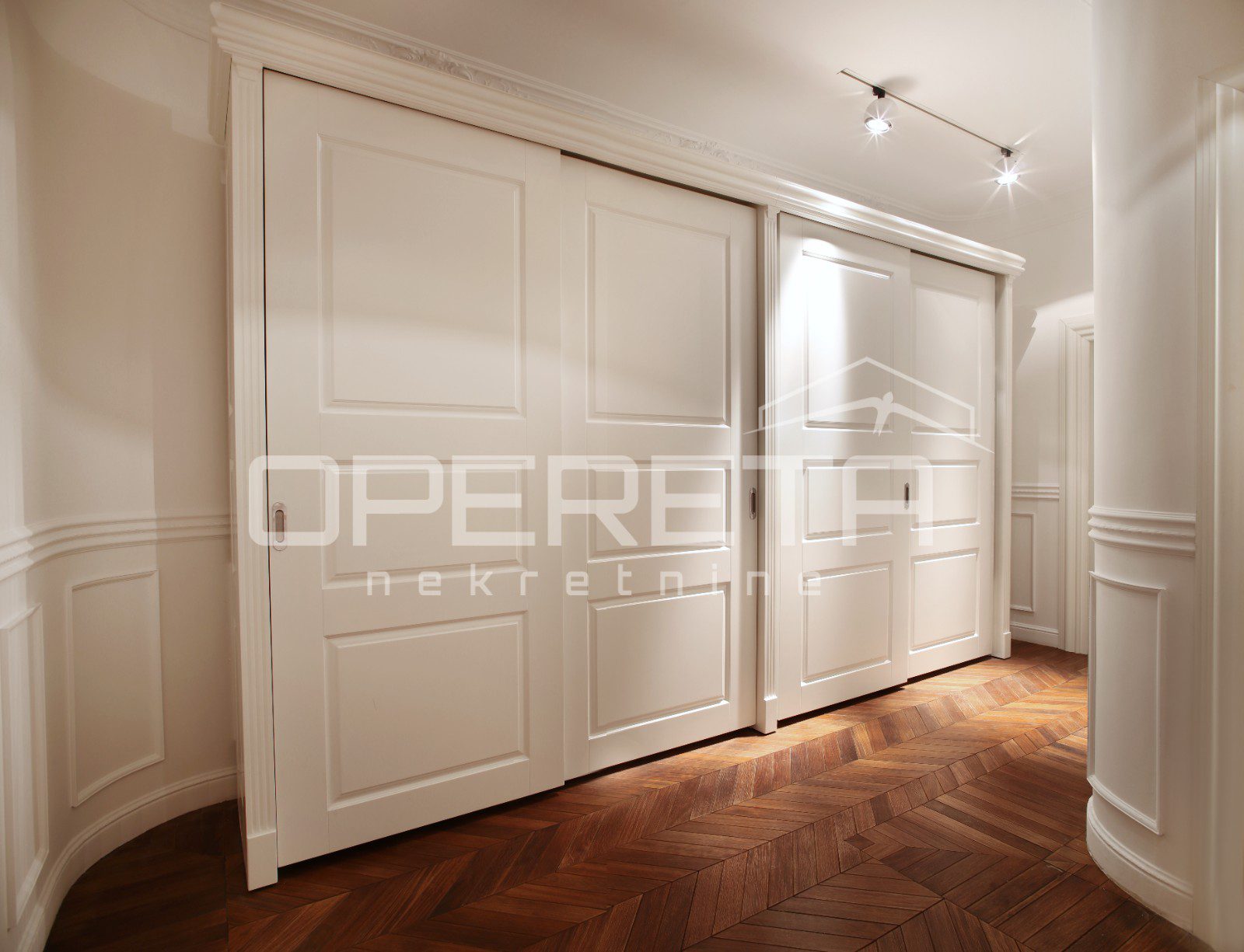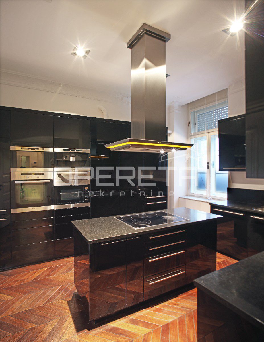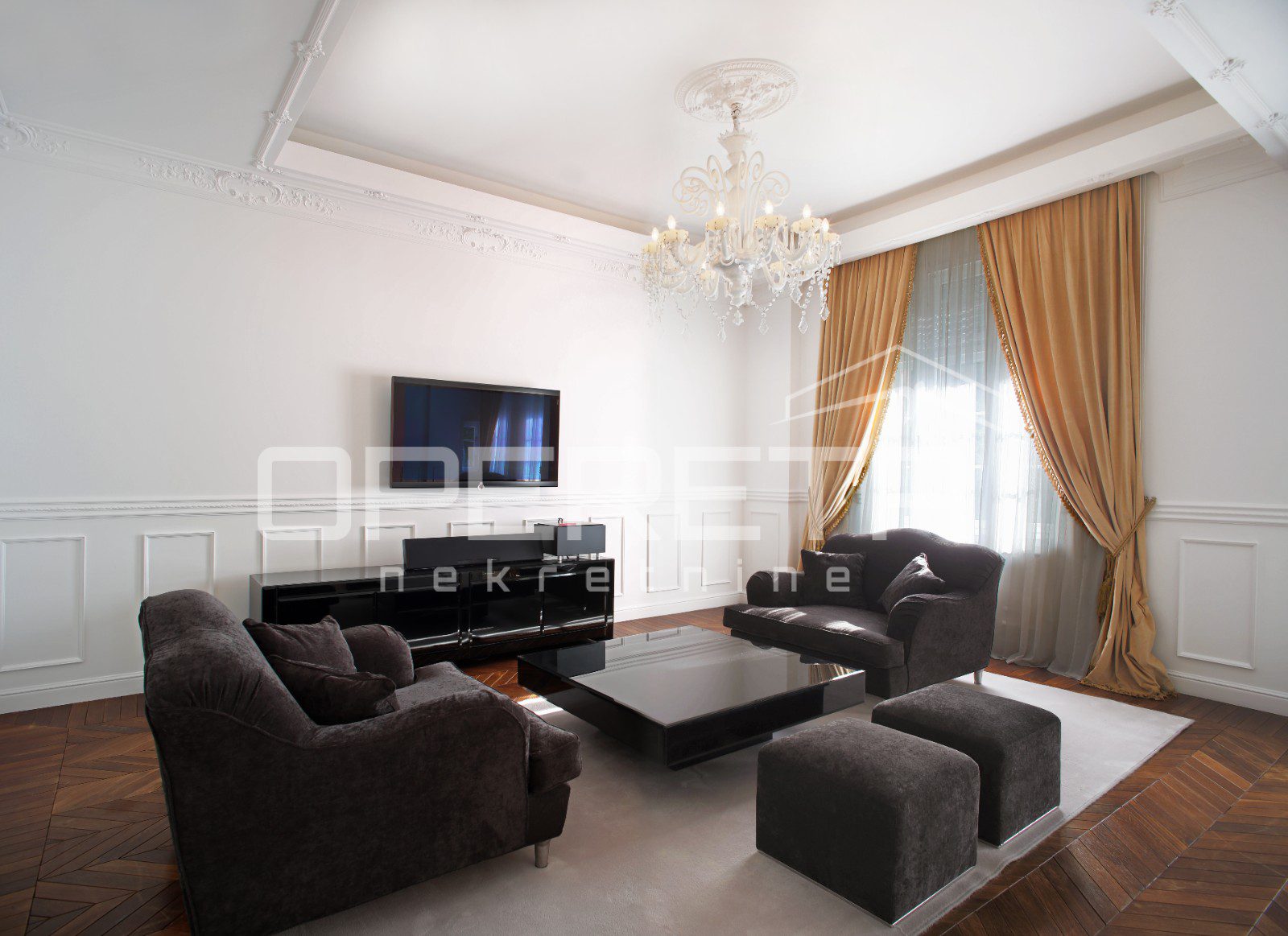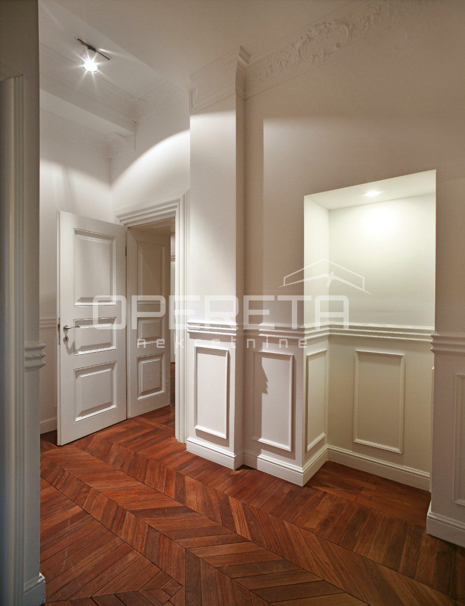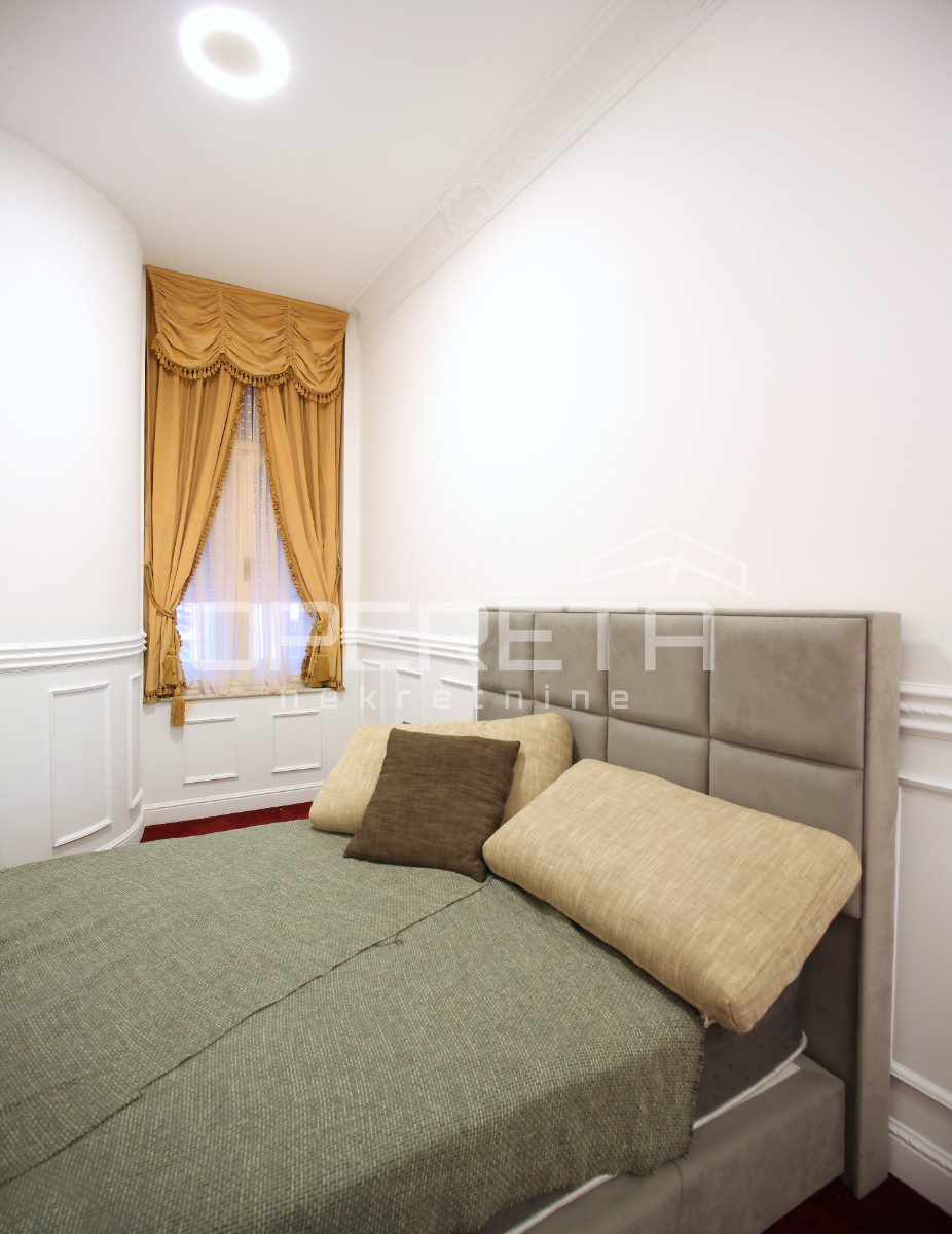 Stan je u potpunosti luksuzno opremljen i renoviran. Visina stropa je 3.45cm, nova stolarija, kvalitetni parketi, kamen u kuhinji i kupaonicama te dizajnerski namještaj i rasvjeta u cijelom stanu.