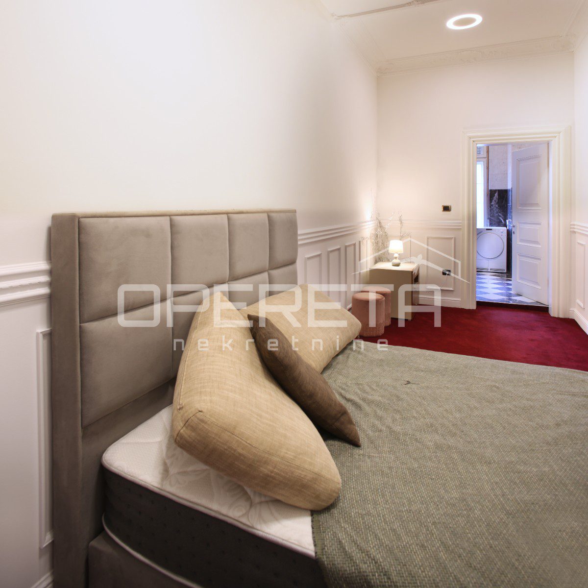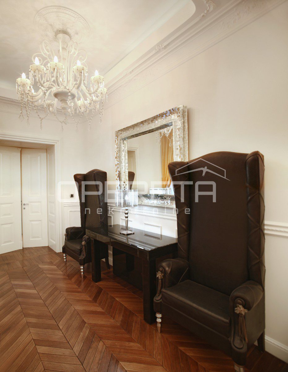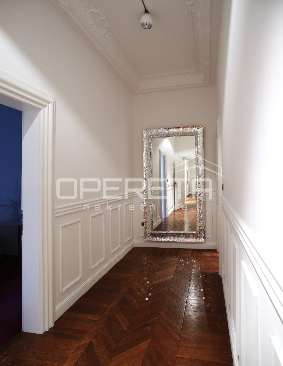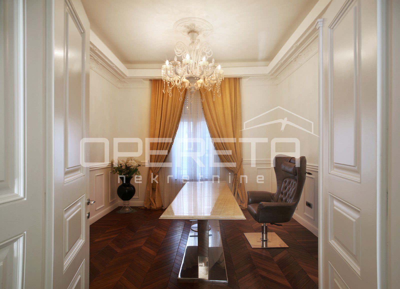 Stan je u potpunosti luksuzno opremljen i renoviran. Visina stropa je 3.45cm, nova stolarija, kvalitetni parketi, kamen u kuhinji i kupaonicama te dizajnerski namještaj i rasvjeta u cijelom stanu.