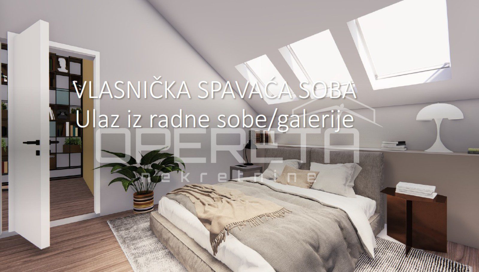 Na gornjoj etaži je predprostor namijenjen radnom dijelu /biblioteci ili sl, 2 sobe, kupaonica i spremište.