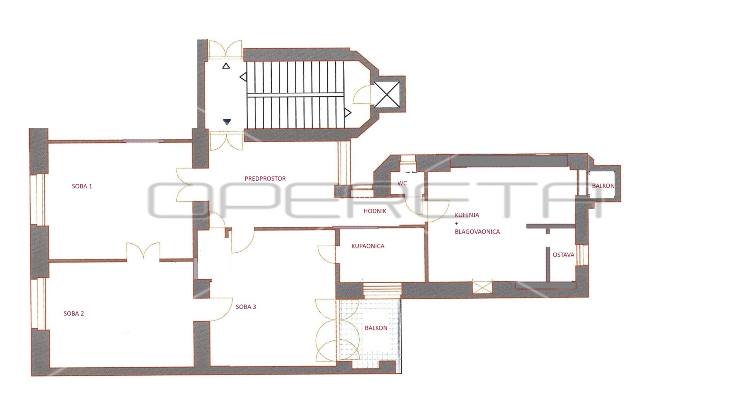 Predivan građanski stan luksuznog i vrlo prilagodljivog tlocrta na 4. katu zgrade s liftom. Stan se sastoji od ulaznog hala, 3 velike sobe od kojih jedna ima vlastitu kupaonicu s wc-om i izlazom na balkon, hodnika, posebnog wc-a,, kuhinje s blagovaonicom i ostavom te izlazom na balkon. Puno svjetla i pogled na zelenilo.