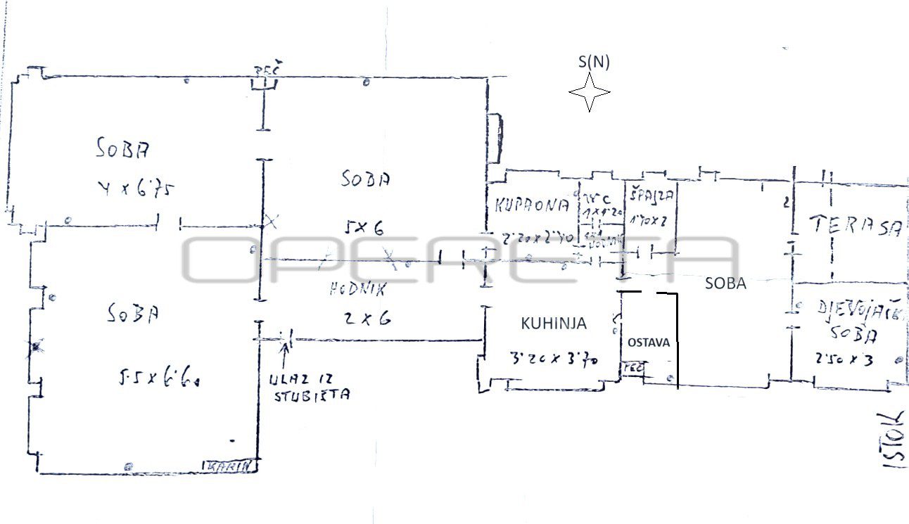 Raskošan i svijeto 4soban građanski stan od 150m2 na 3.katu u obnovljenoj zgradi bez lifta. Sastoji se od dvije salonske sobe s lijepim pogledom na Marulićev trg, tj. na zapad, dvije veće spavaće sobe koje gledaju na mirniju istočnu, dvorišnu stranu, te jedne manje “djevojačke” sobe, hodnika, kuhinje s blagovaonicom, kupaonice, wc-a, 2 ostave te prostrane terase. Stanu pripada i spremište u podrumu. Na zgradi su ojačani krov i stubište te je obnovljena ulična i dvorišna fasada. U stanu je postavljena pvc vanjska stolarija, a u zidove su ugrađene protupotresne mrežice.