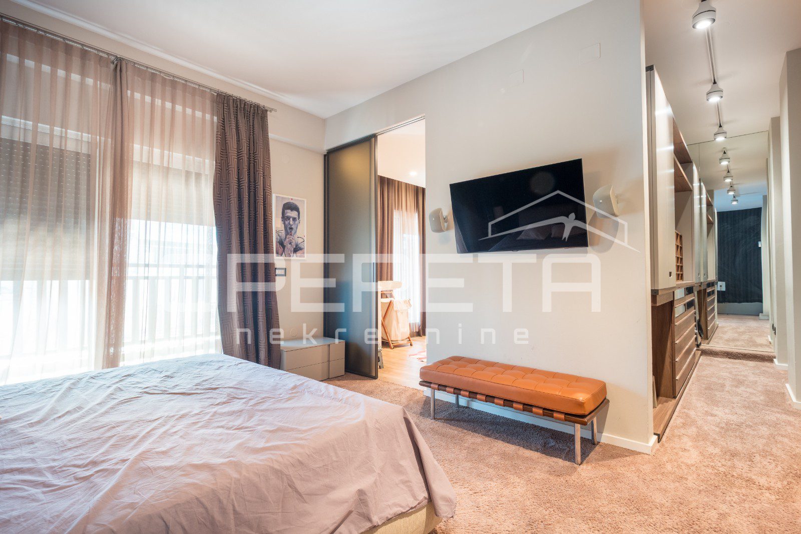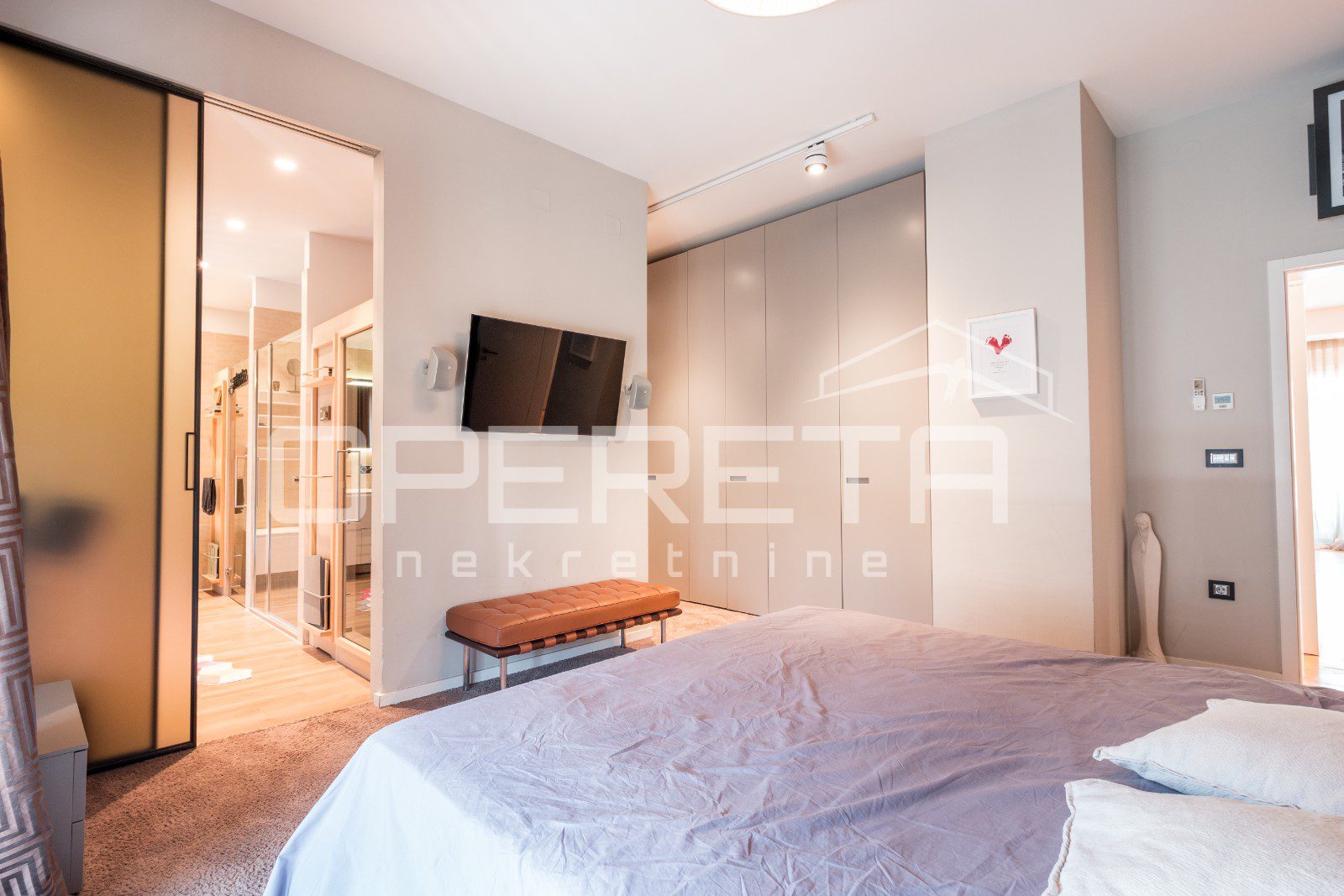 Master spavaća soba od 26m2 ima prostranu kupaonicu sa saunom, te izlazom na dvorišnu terasu.