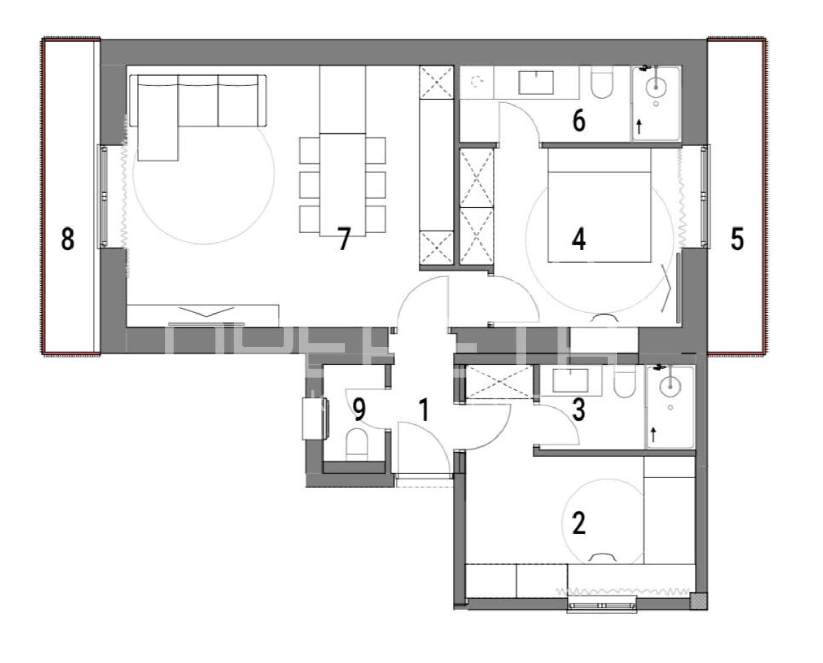 Sastoji se od ulaznog prostora, open space dnevnog boravka s kuhinjom blagovaonicom površine 28 m2, dvije spavaće sobe, dvije kupaonice, gostinjskog toaleta te dva balkona.