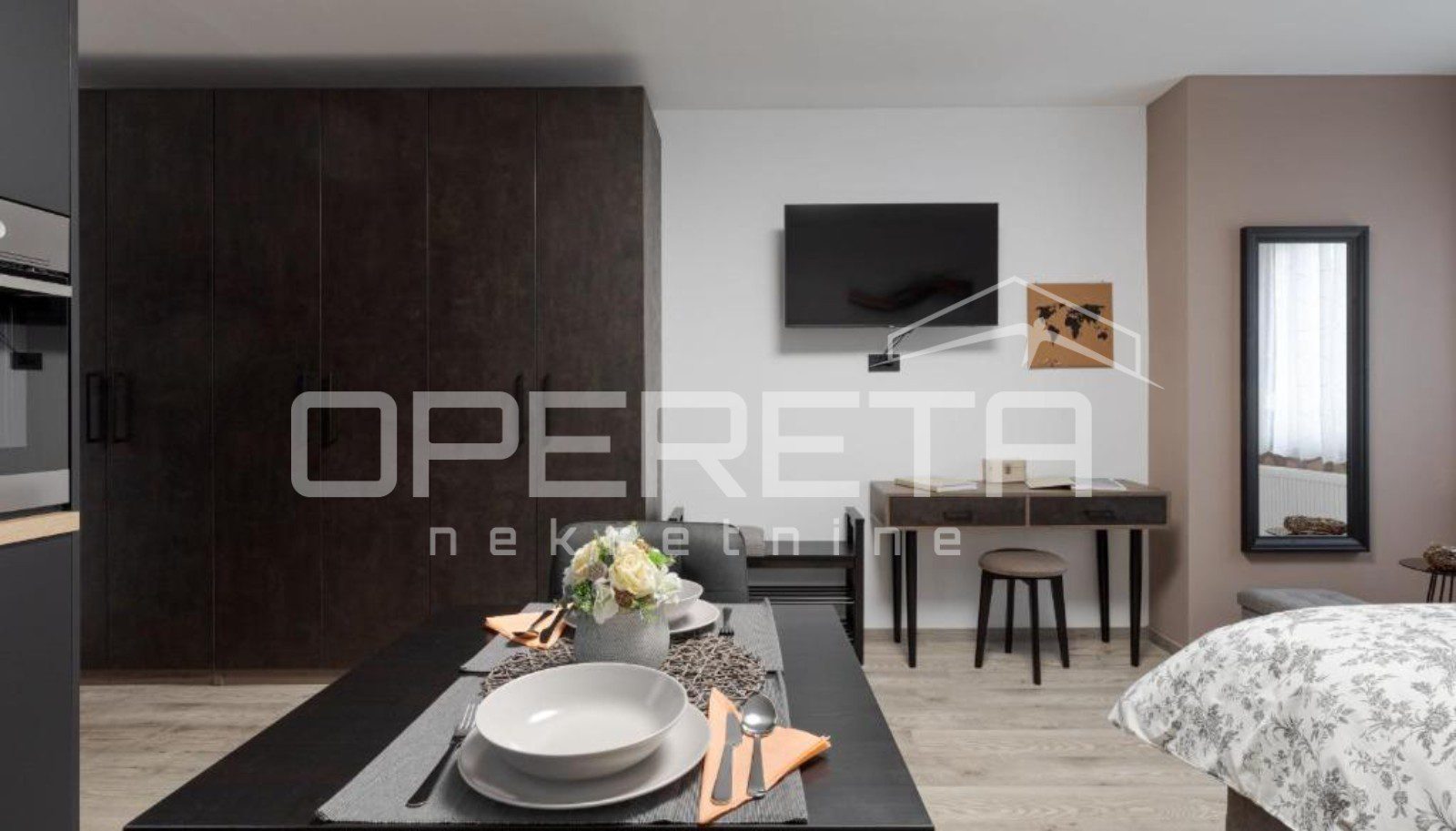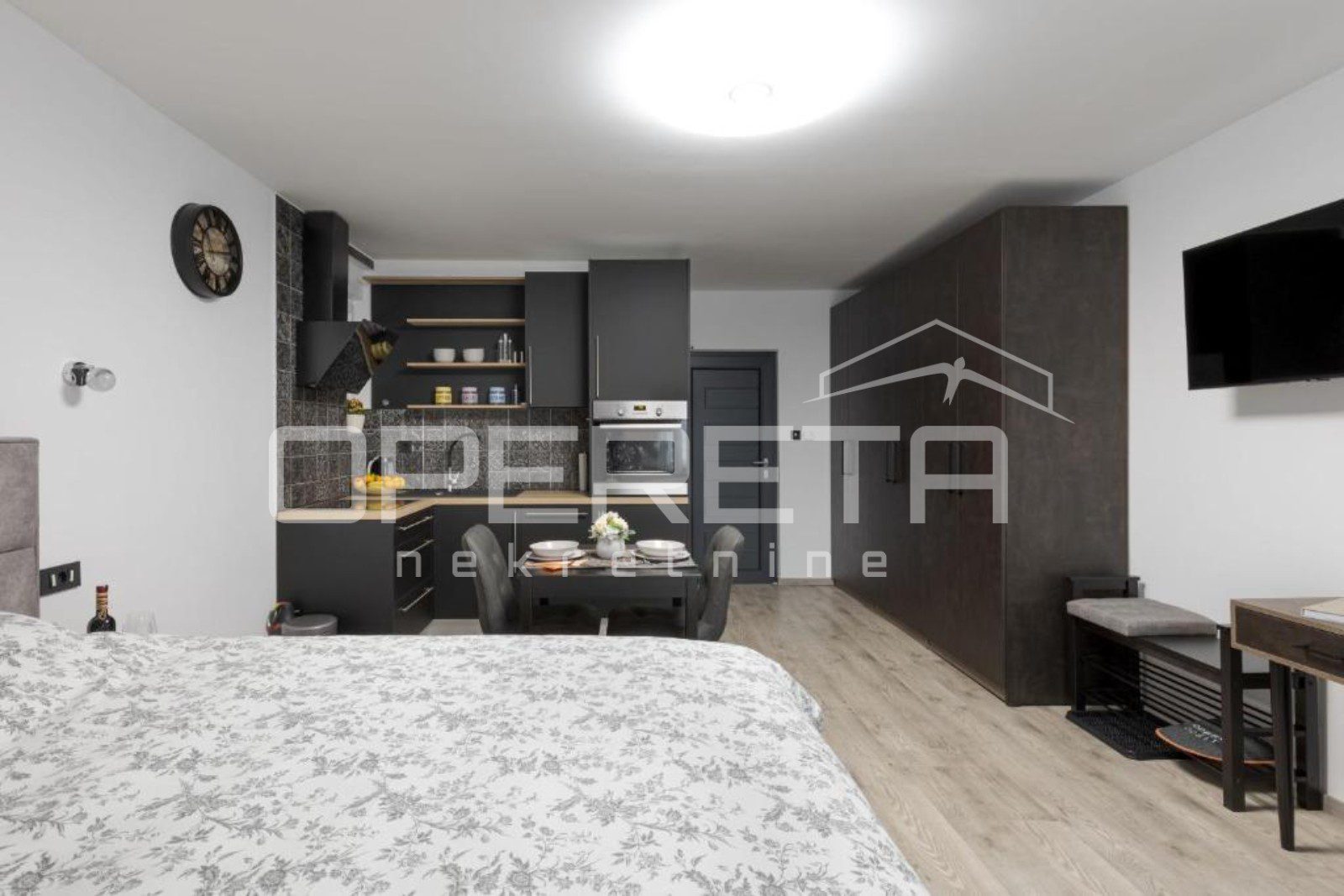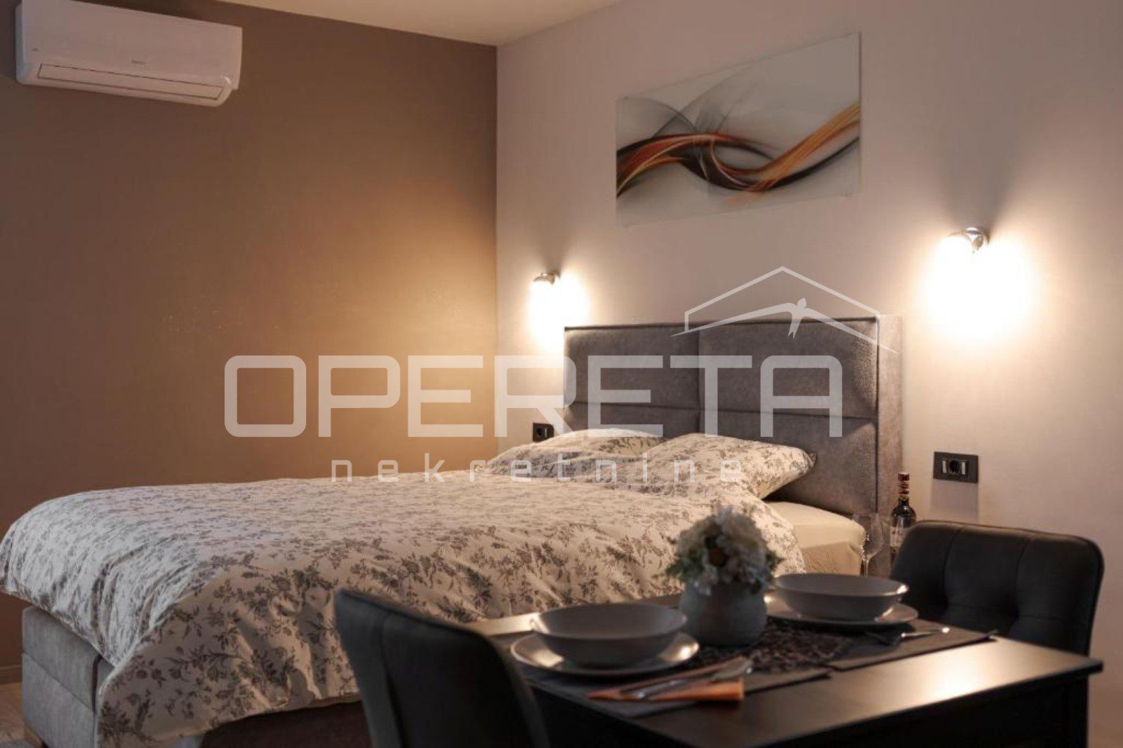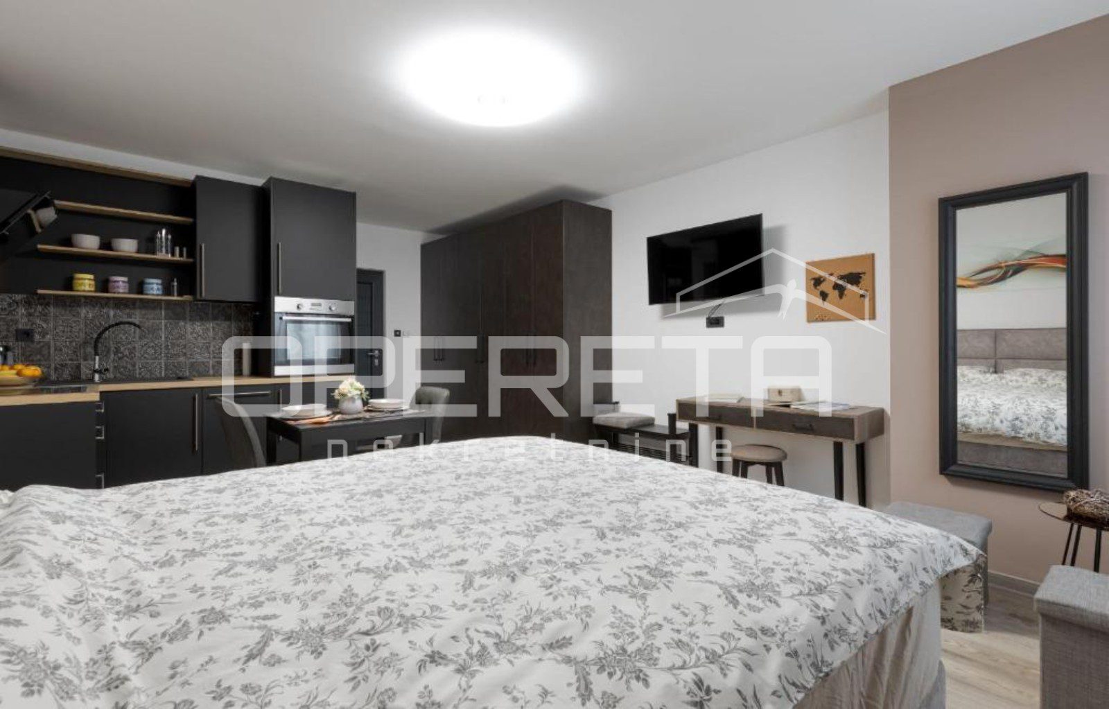 – garsonijera od 33 m² odiše toplinom i modernim uređenjem, sastoji se od potpuno opremljene kuhinje s blagovaonicom, prostranog dijela za spavanje s bračnim krevetom te elegantne kupaonice.