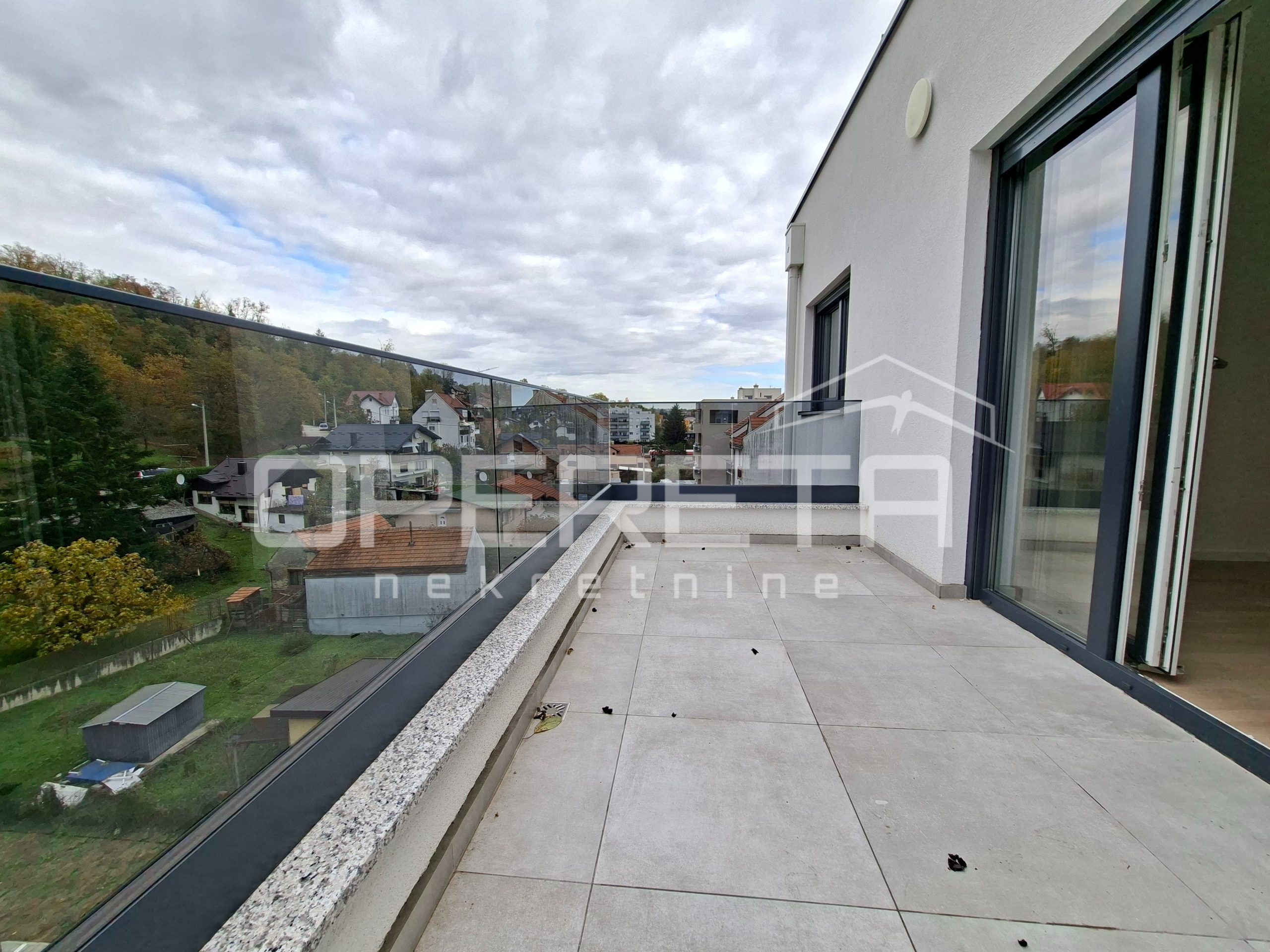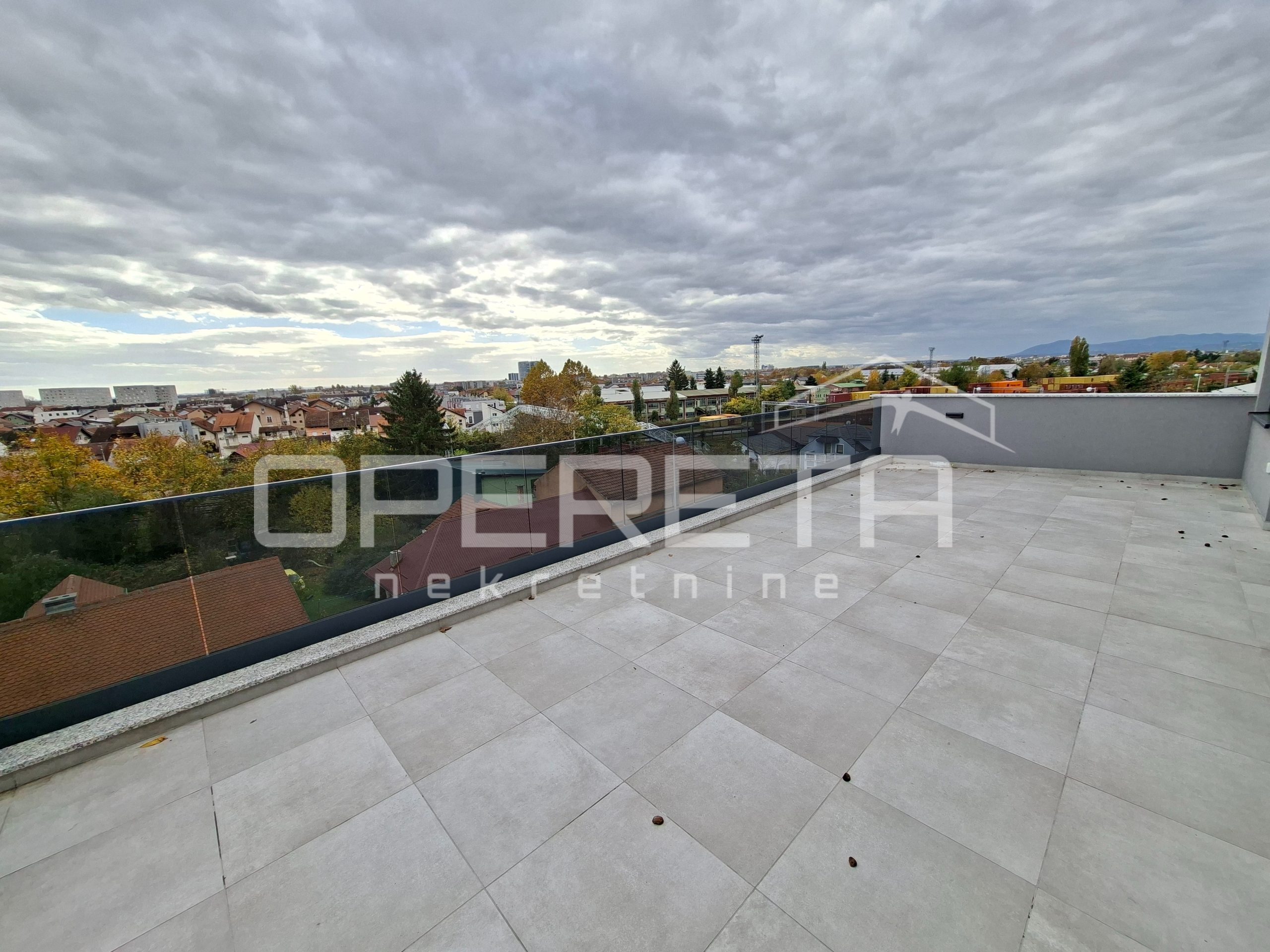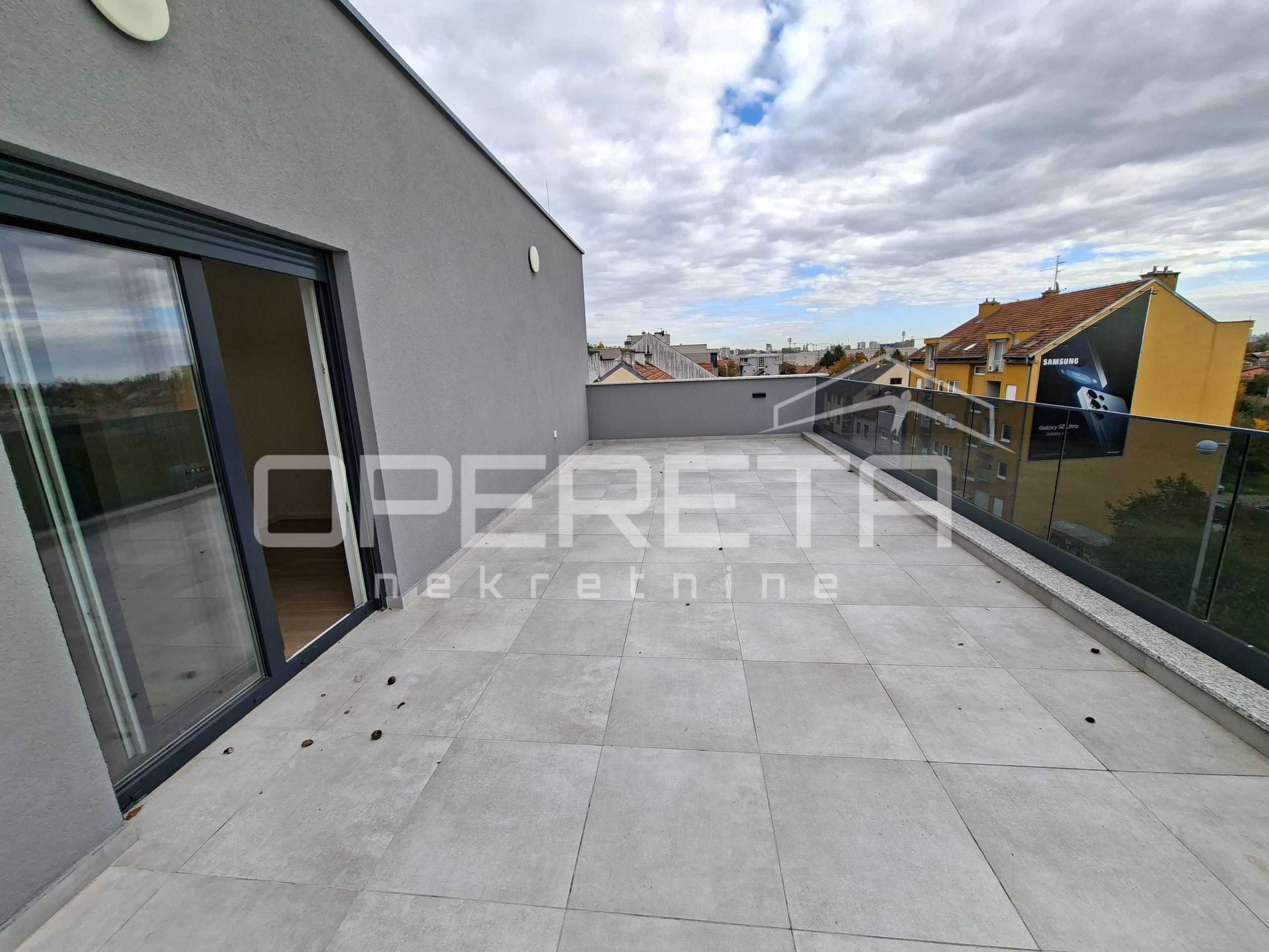 STAN PRODAJA, ZAGREB, KUSTOŠIJA, ILICA, 112m2, PENTHOUSE. Odličan četverosobni penthouse na četvrtom katu novogradnje na Ilici sa prekrasnom pogledom na cijeli grad u zgradi sa liftom. Stan ima 97,28m2 stambene površine. Sastoji se od hodnika, spremišta, WC-a, kupaonice, kuhinje sa blagovaonicom i dnevnim boravkom i tri spavaće sobe. U Ukupnu navedenu kvadraturu su obračunati balkon 9,67 m2 (koef. 2,42m2) i terase od 19,34m2 (koef. 4,83m2) te dva vanjska parkirna mjesta po 12,50m2 (koef.3,13m2) i 17,09m2 (koef. 4,27m2). Temelj je na armirano betonskoj temeljnoj ploči, vanjski i unutarnji nosivi zidovi su od armiranog betona te ojačani horizontalnim i vertikalnim armirano-betonski serklažima. Stropovi, odnosno međuetažne konstrukcije su izvedene kao armirano-betonske ploče. Odvojena mjerila struje i vode, električni podizači roleta, PVC stolarija. Nalazi se na odličnoj lokaciji, u neposrednoj blizini svih potrebnih sadržaja. Preko puta zgrade nalazi se autobusna stanica, okretište Črnomerec svega tri autobusne stanice od zgrade.