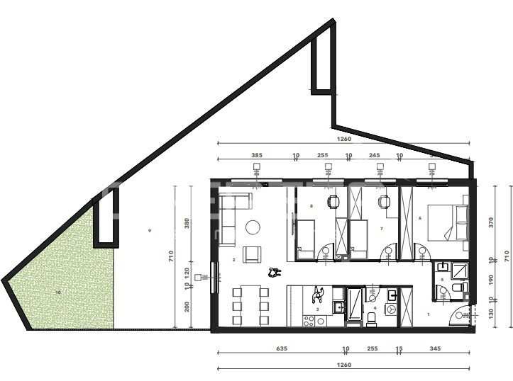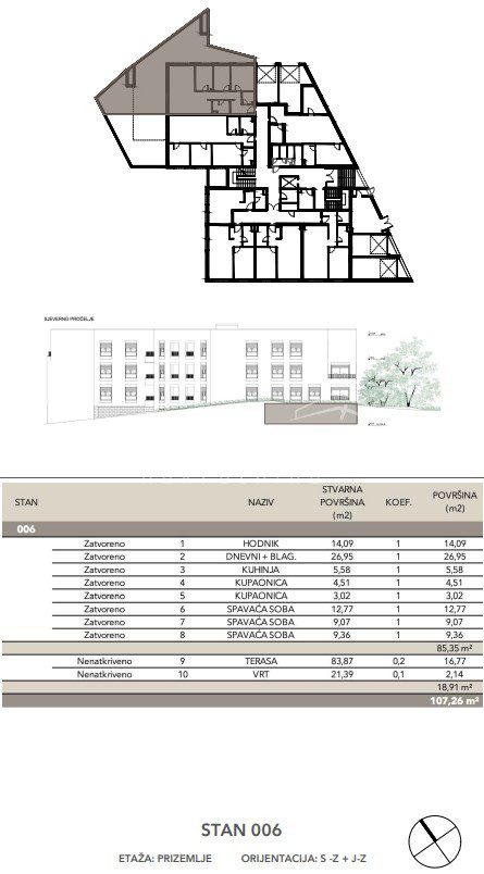 Sastoji se od ulaznog hodnika, kuhinje s blagovaonicom i dnevnog boravka, 3 spavaće sobe, dvije kupaonice, terase i vrta. Uz stan je potrebno kupiti garažno mjesto i spremište.