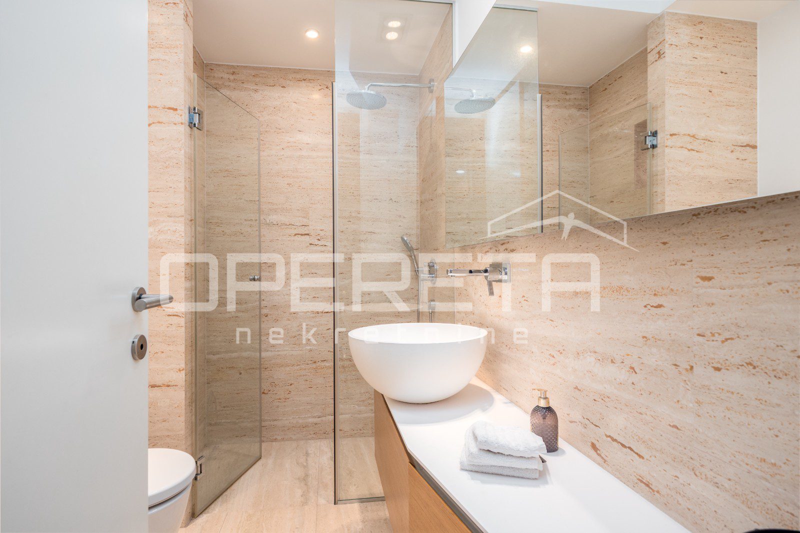 Obilježje cijelog stana je raskošni kamen travertin koji se proteže od ulaznog prostora, kroz sve kupaonice, stepenište i kuhinju.