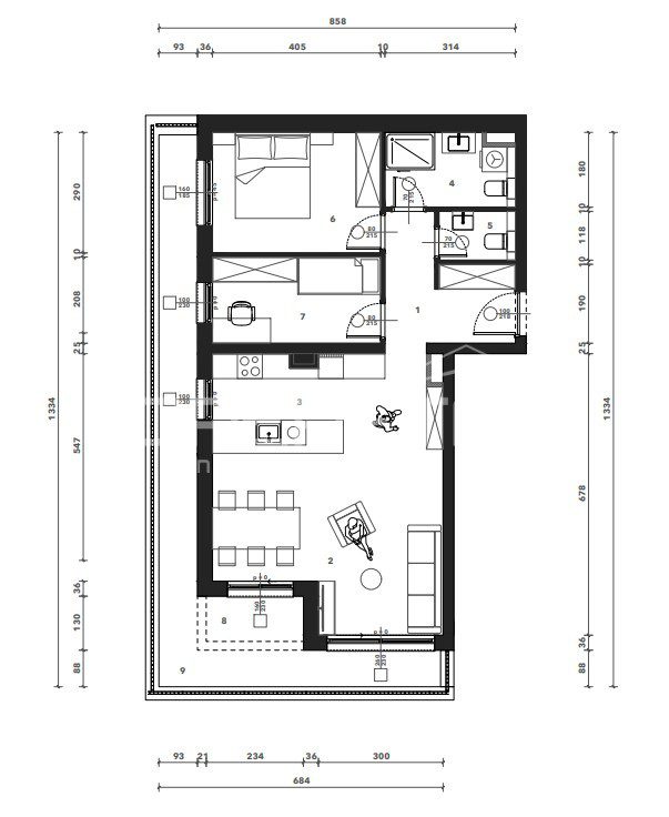 Sastoji se od ulaznog hodnika, kuhinje s blagovaonicom i dnevnog boravka, 2 spavaće sobe, kupaonice, WC-a i 2 terase. Uz stan je potrebno kupiti garažno mjesto i spremište.
