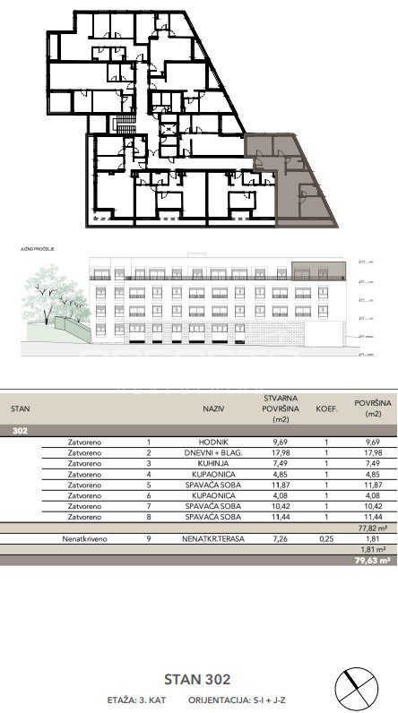 Sastoji se od ulaznog hodnika, kuhinje s blagovaonicom i dnevnog boravka, 3 spavaće sobe, 2 kupaonice i terase. Uz stan je potrebno kupiti garažno mjesto i spremište.