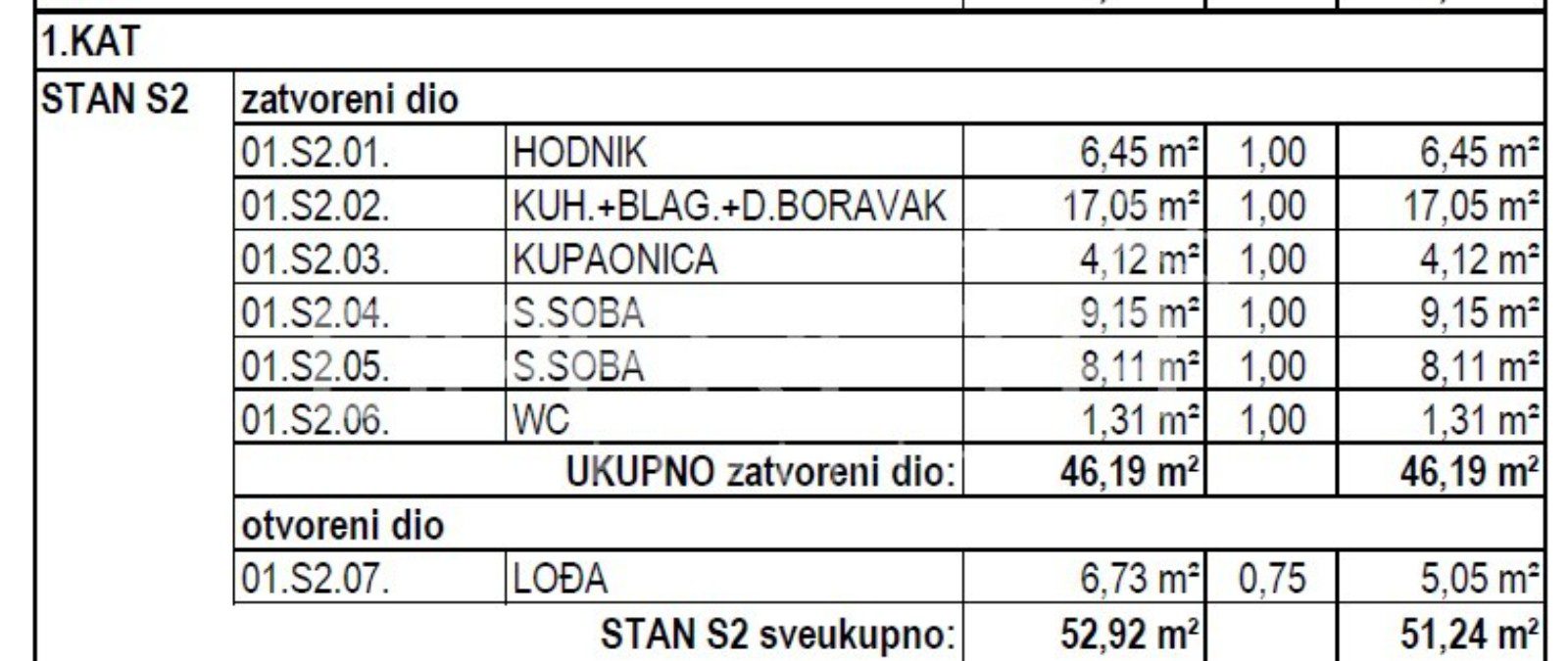 Neto korisna površina stana iznosi 55,07 m2 (51,24 m2 stan; 1,33 m2 spremište; 2,5 m2 vanjsko parkirno mjesto).
