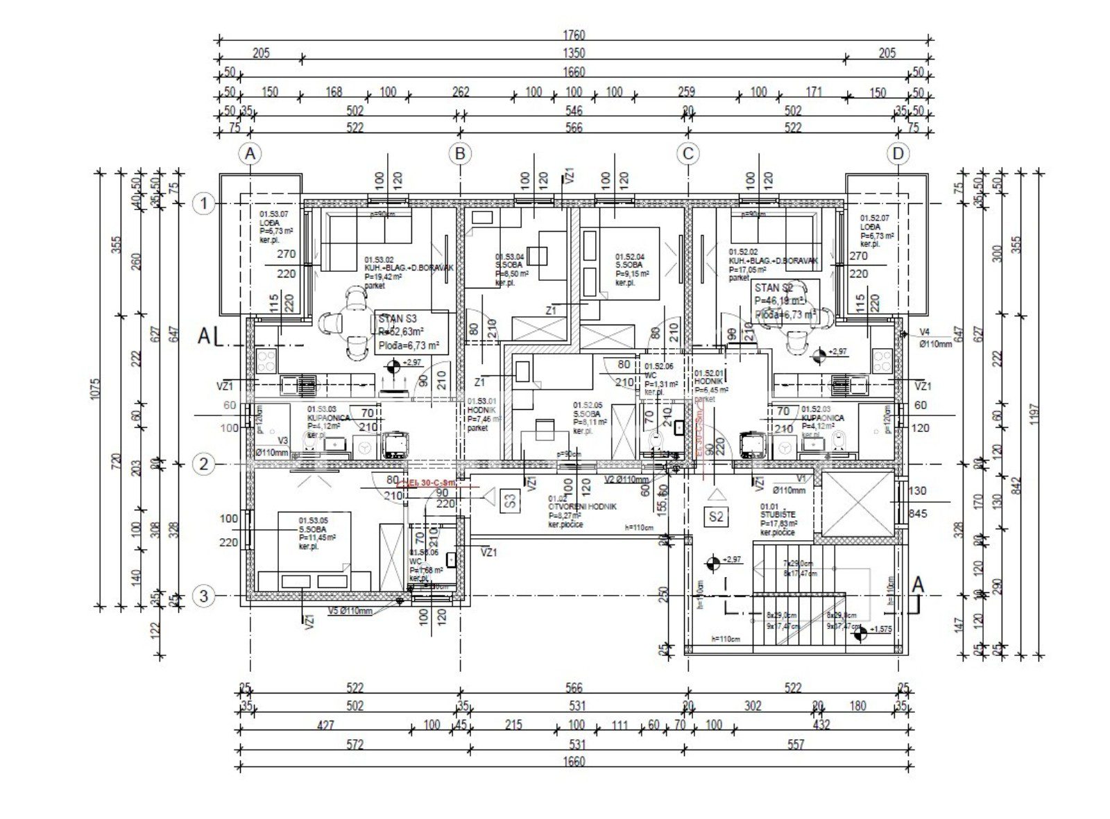 Prodaje se trosoban stan (zgrada C, S2) na 1. katu u luksuznoj novogradnji. Zgrada sadrži 4 stambene jedinice raspoređene na tri etaže. Cijeli projekt obuhvaća četiri zgrade s ukupno 16 stanova veličine od 47 m2 do 120 m2. Zgrade imaju lift. Okruženje šumom osigurava mir i privatnost. Planirani završetak gradnje je kraj 2026.