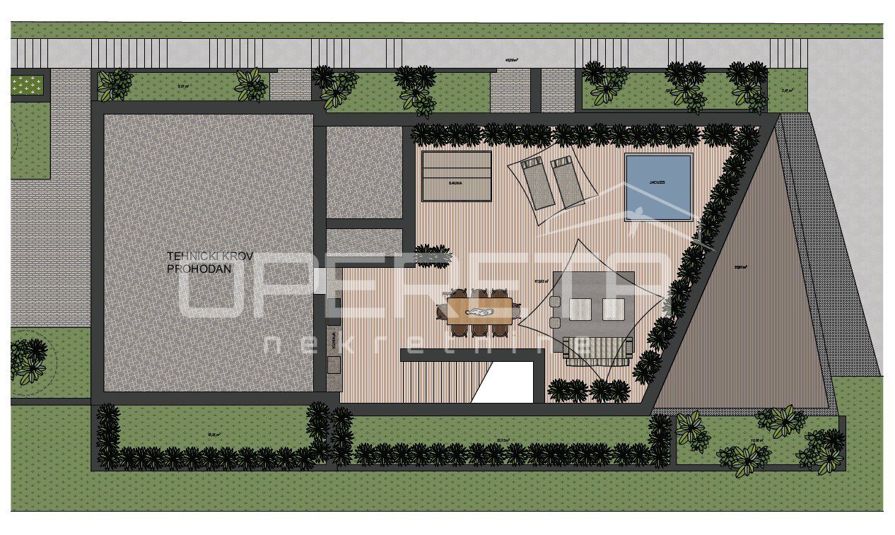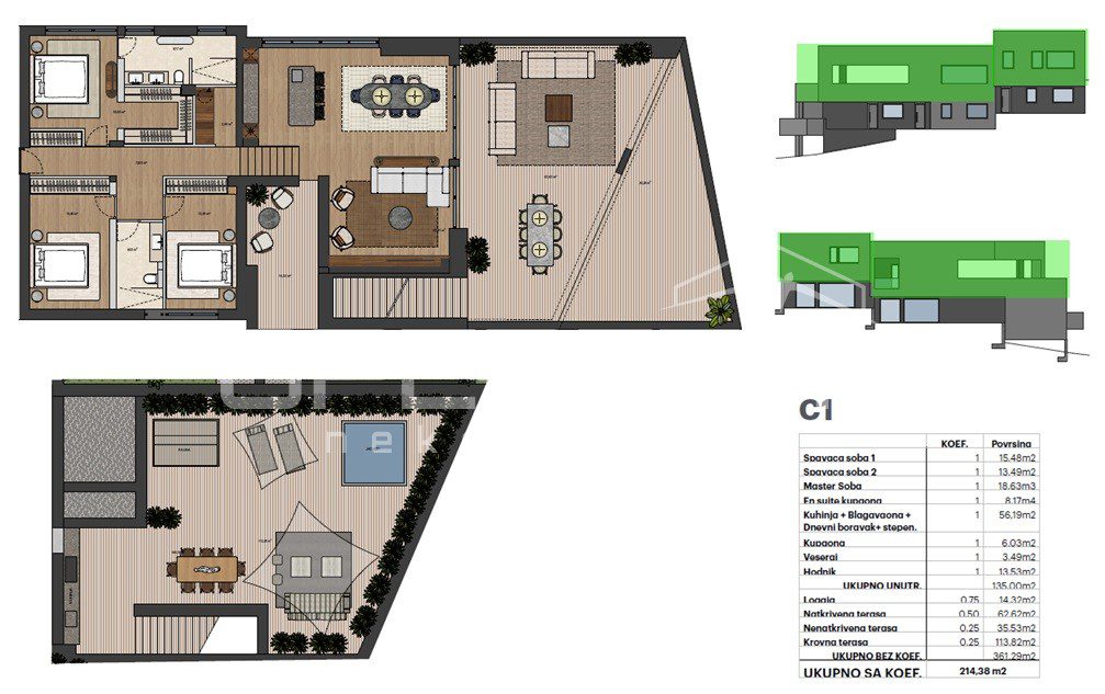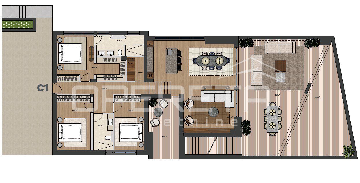 Penthouse stambene kvadrature 135,00m2 sa prostranom krovnom terasom, nenatkrivenom terasom i loggiom sastoji se od prostranog boravka sa kuhinjom i blagovaonicom, master spavaće sobe sa vlastitom kupaonicom, 2 dodatne spavaće sobe, kupaonice i vešeraja.