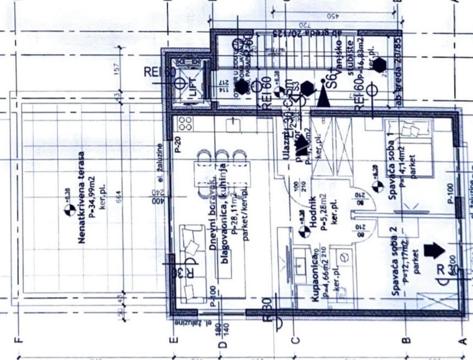 Stan se sastoji od ulaznog prostora, open space kuhinja/boravak (28m2), 2 spavaće sobe 12,17m2, 14,14m2, 10.4m2), kupaone, terasa (35m2)