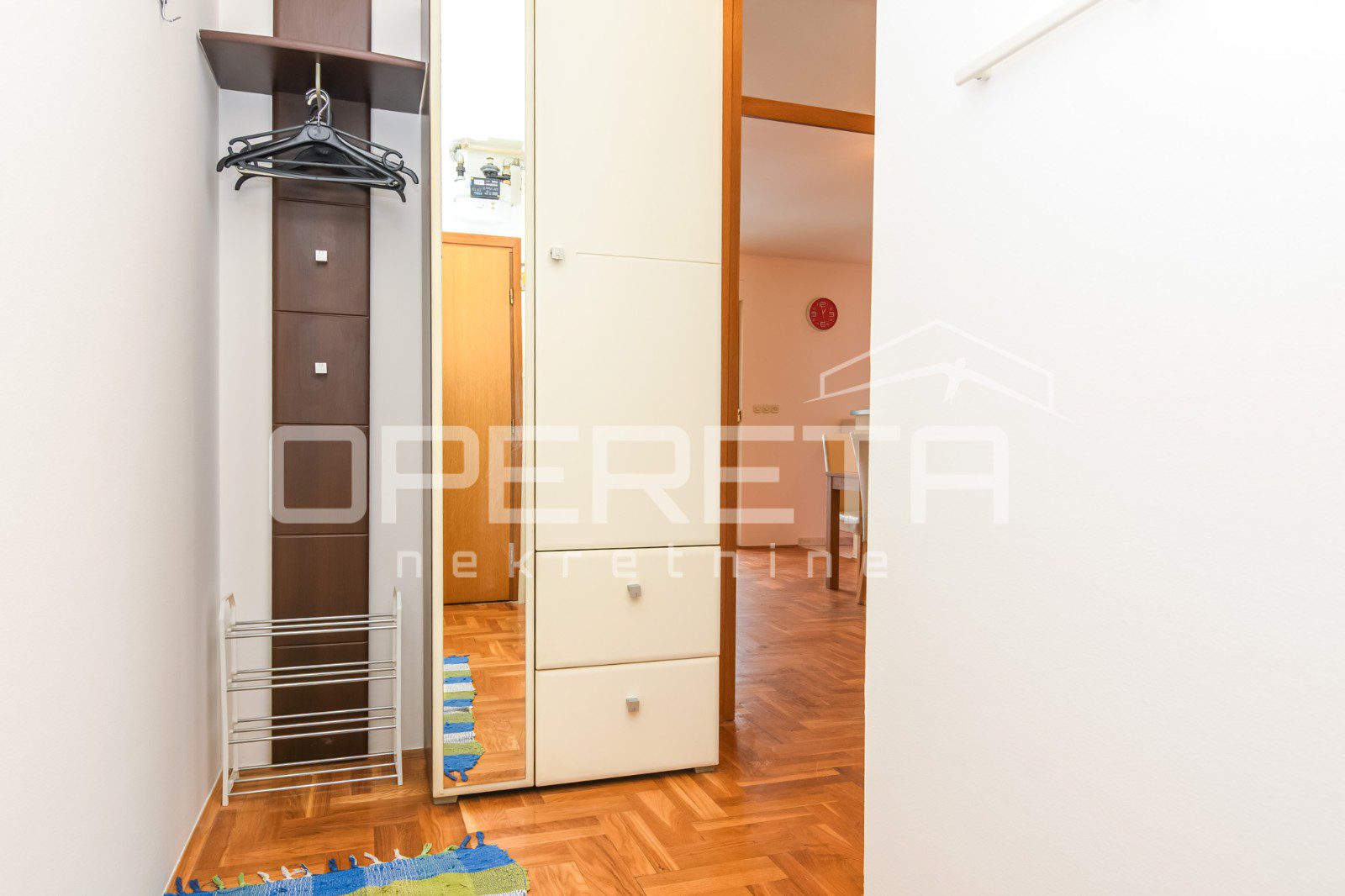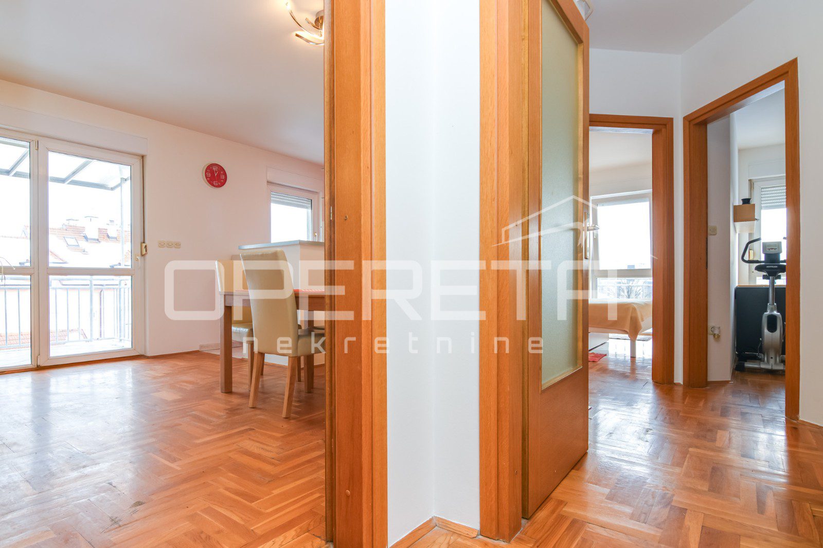 Trosoban stan na 3. katu novije zgrade bez lifta, istok-jug orijentacija. Sastoji se od ulaznog hodnika, otvorenog i sunčanog dnevnog boravka s blagavaonicom i kuhinjom te izlazom na balkon, kupaonice s kadom, dvije spavaće sobe.