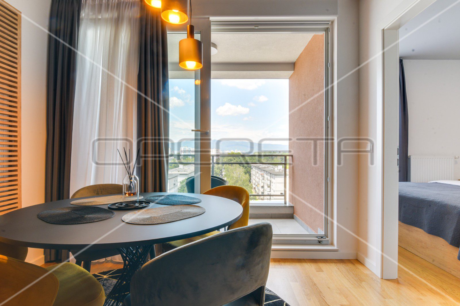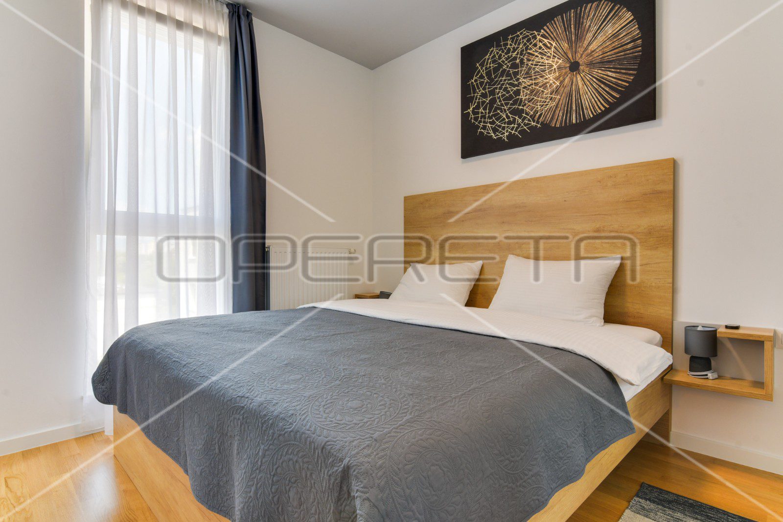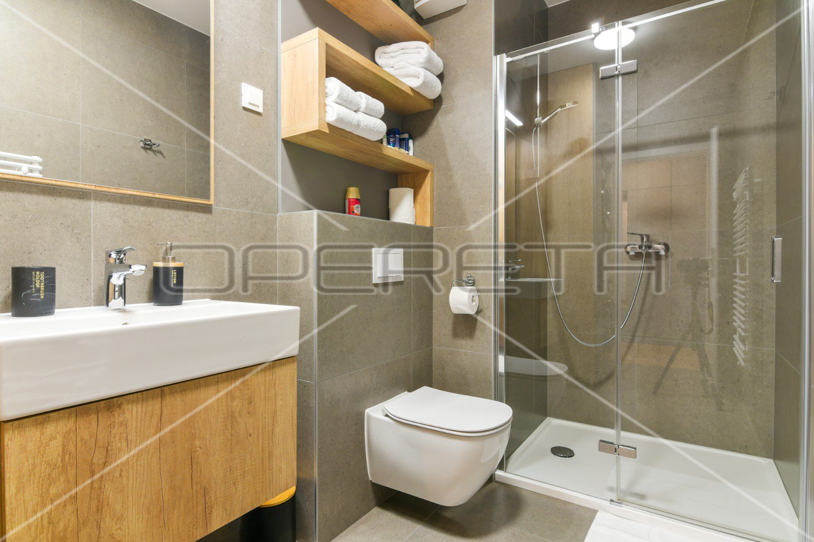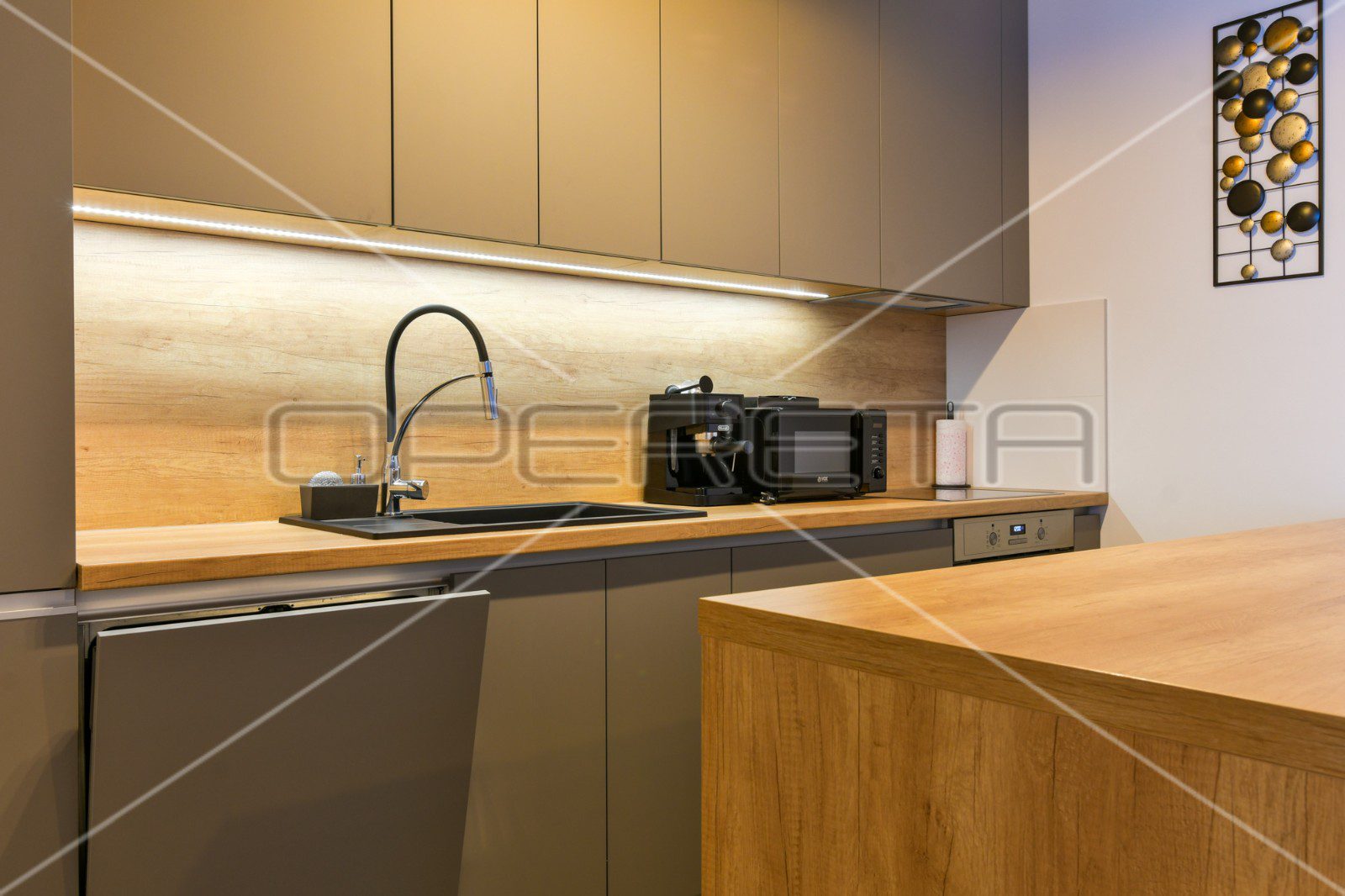 Stan je u potpunosti namješten, skladnim dizajnerskim namještajem kao i svim uređajima potrebnim za svakodnevni život, od perilice rublja i suđa, do kava aparata, mikrovalne pećnice, sokovnika i prijenosnog grilla…