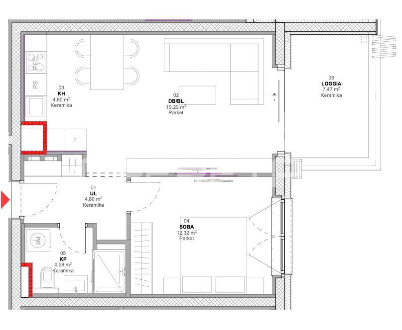 Stan je veličine 45,49m2 s loggiom 7,12m2 te pripadajućim parkirnim mjestom veličine 13,42m2. Što sve zajedno, obračunato po koeficijentima čini 57,54 m2 ove iznimno atraktivne nekretnine.