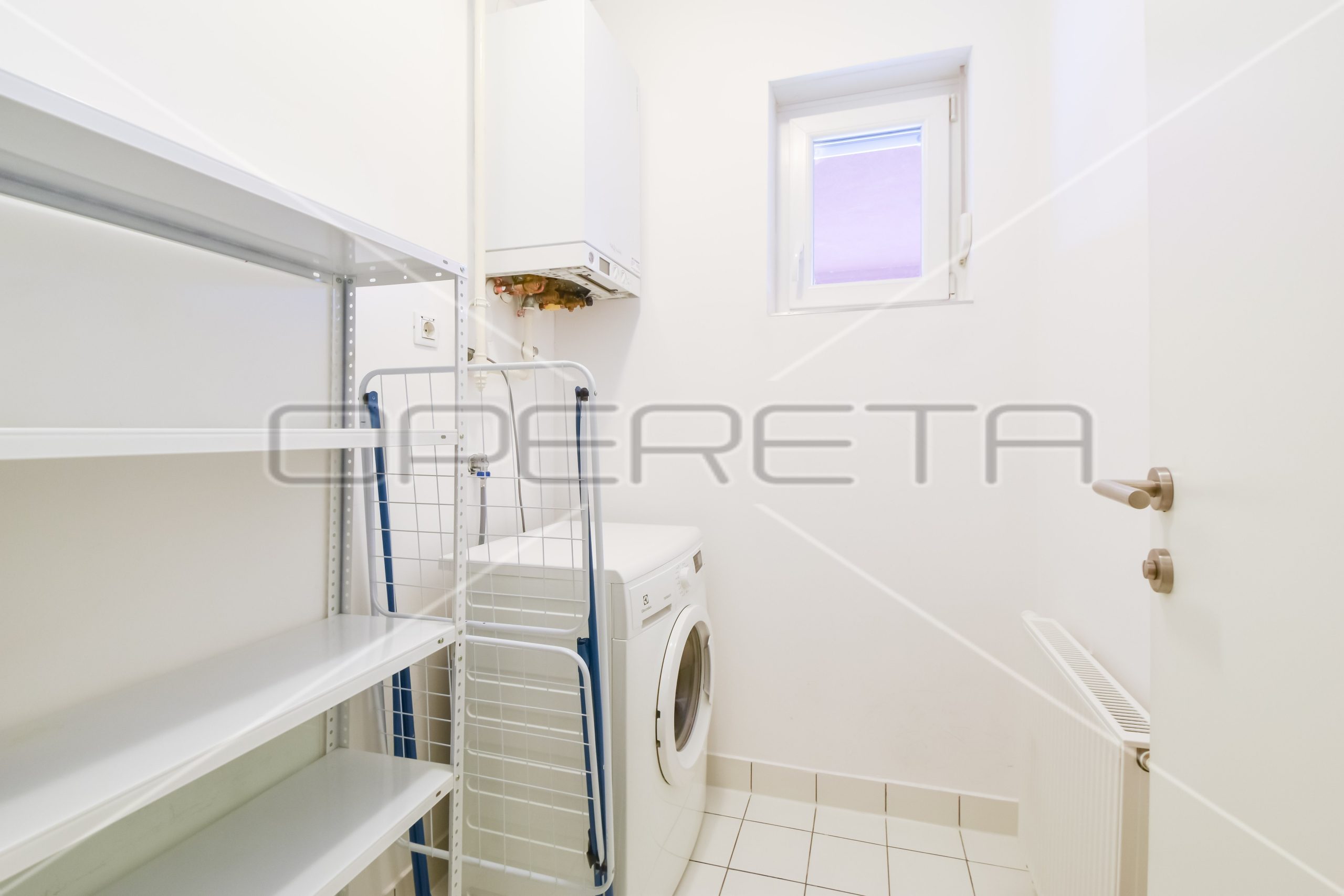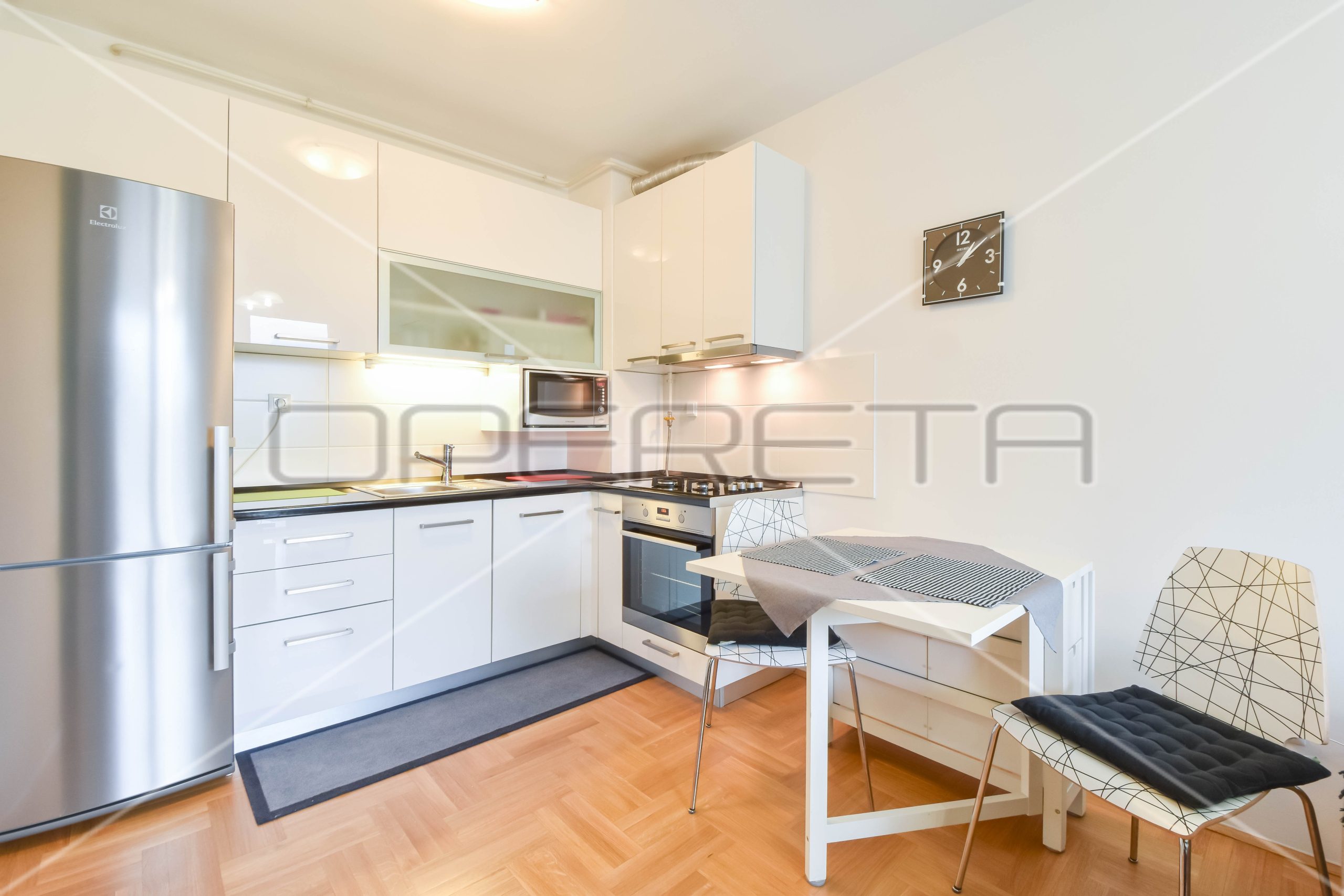 Stan se sastoji od ulaznog hodnika, kupaonice sa WC-om, spremišta sa veš kuhinjom, spavaće sobe te kuhinje sa dnevnim boravkom i blagovaonicom koji imaju izlaz na loggiu. Stan se iznajmljuje potpuno namješten novijim namještajem i opremljen svih aparatima potrebnim za život – klima, perilica rublja, perilica suđa, kuhinja.. Idealno za samca ili par.