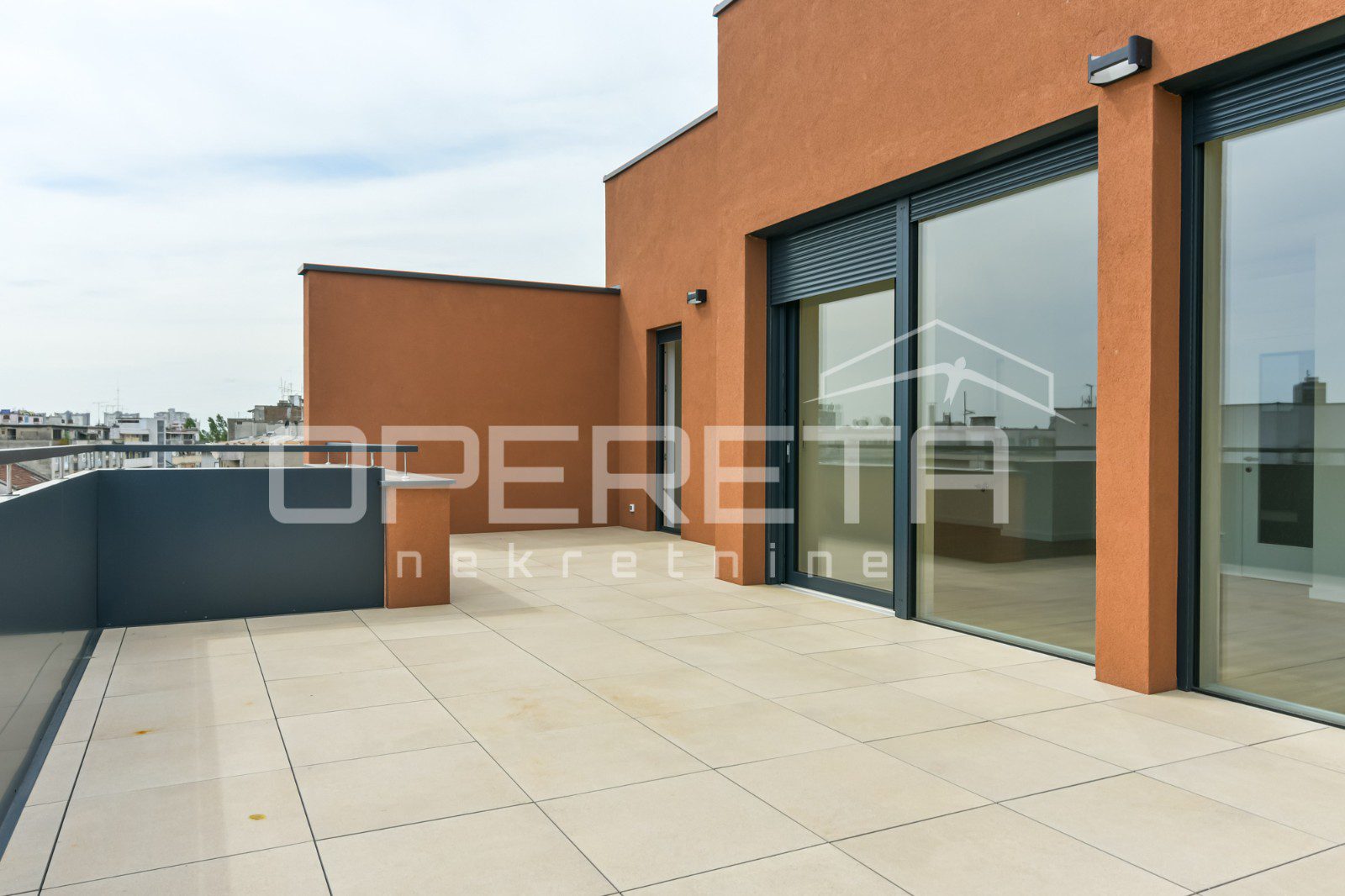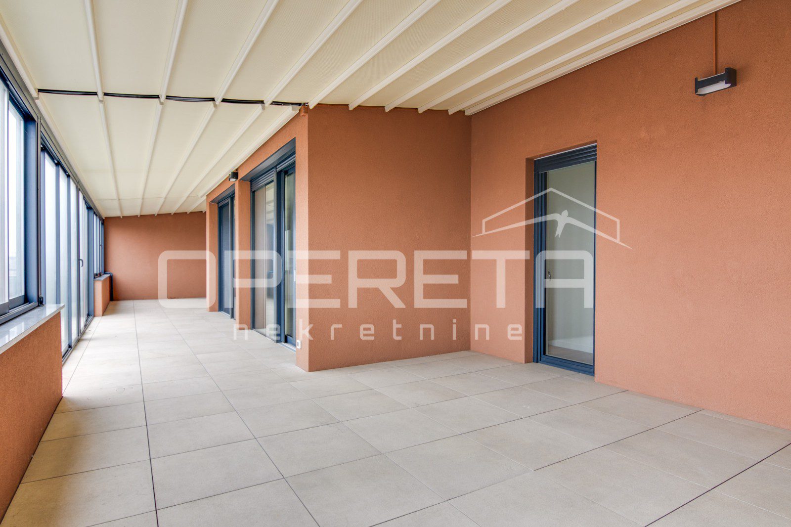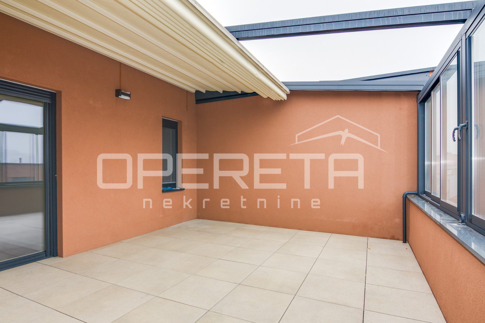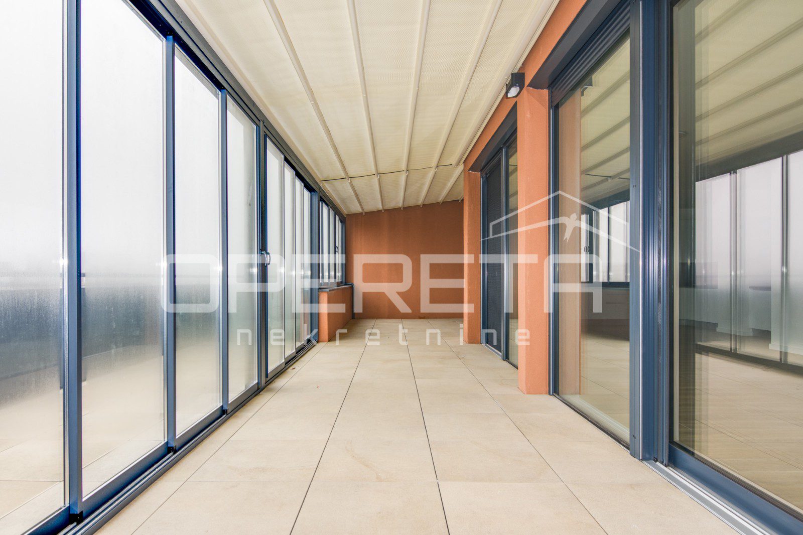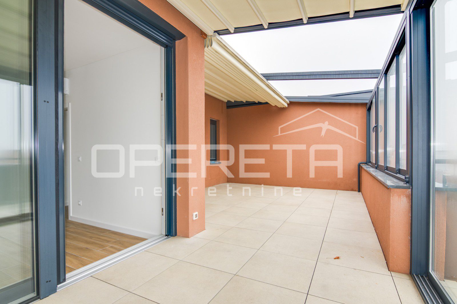 Peterosoban penthouse na 5. katu (jedini stan na cijeloj etaži) s liftom koji se sastoji od tri hodnika, 1 open space prostor s kompletnom kuhinjom + 4 spavaće sobe ,tri kupaonice ukupne podne površine 131,29 m² + natkrivena terasa površine cca 20m2 + spremište u razizemlju+ zatvorena garaža na -1, parkirno mjesto u garaži i vanjsko parkirno mjesto ( sveukupno pripadaju 3 parkinga).