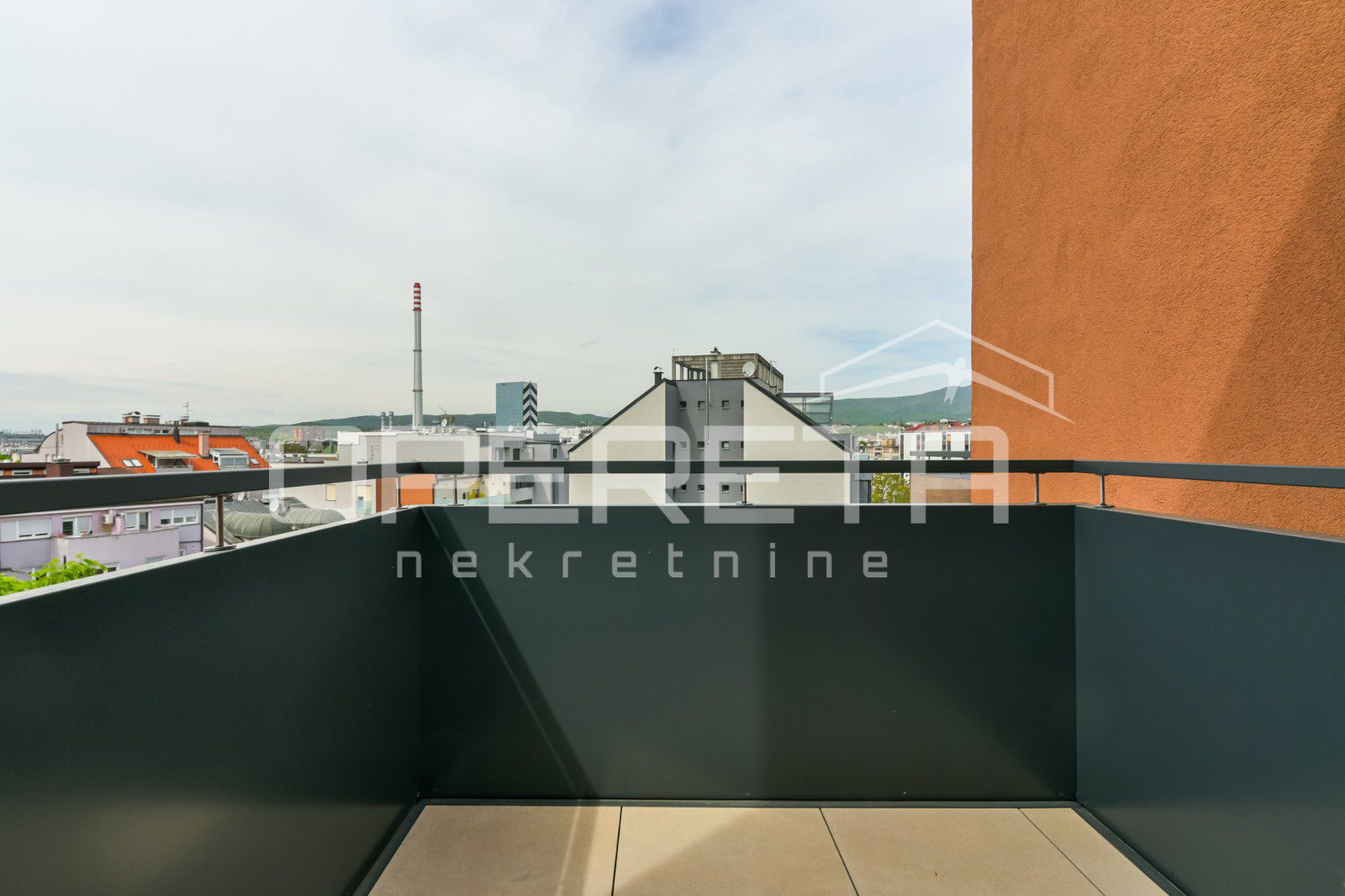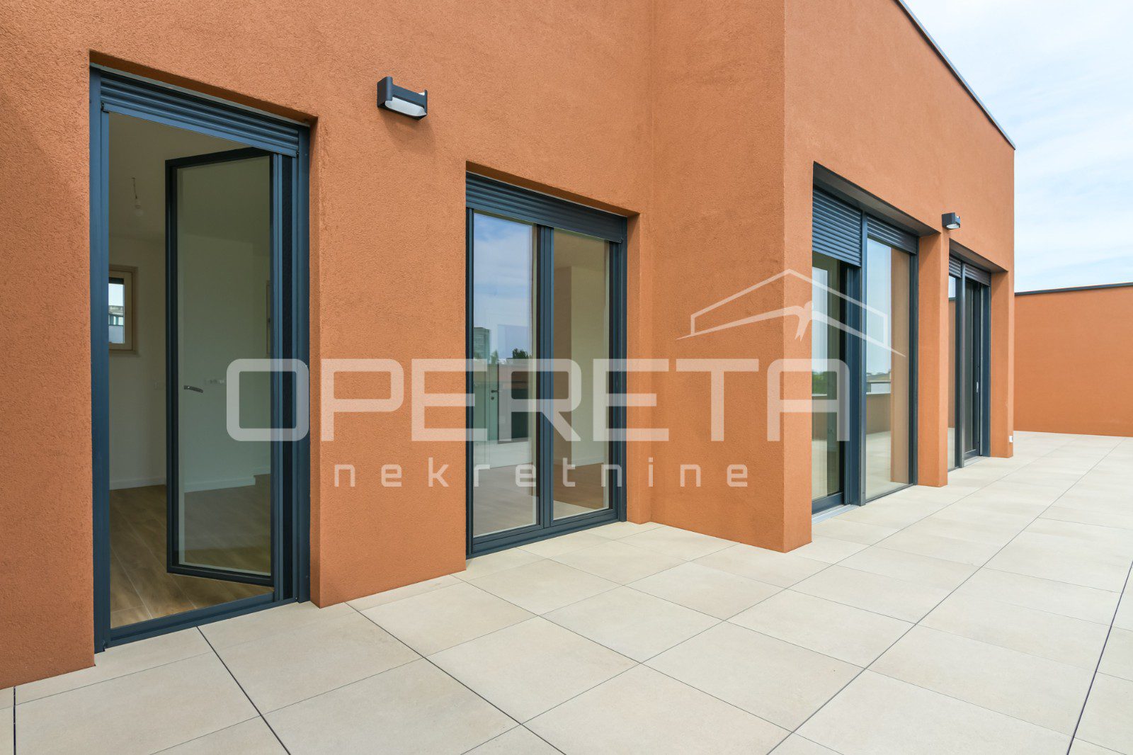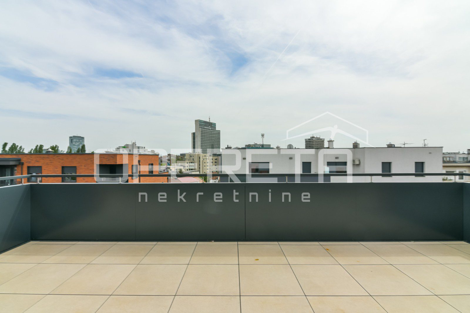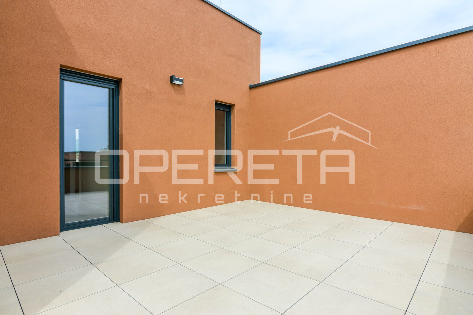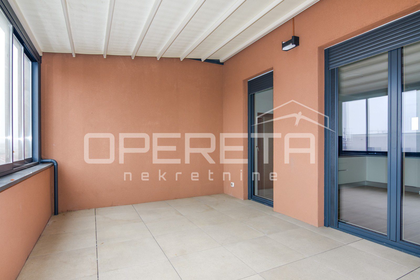 Peterosoban penthouse na 5. katu (jedini stan na cijeloj etaži) s liftom koji se sastoji od tri hodnika, 1 open space prostor s kompletnom kuhinjom + 4 spavaće sobe ,tri kupaonice ukupne podne površine 131,29 m² + natkrivena terasa površine cca 20m2 + spremište u razizemlju+ zatvorena garaža na -1, parkirno mjesto u garaži i vanjsko parkirno mjesto ( sveukupno pripadaju 3 parkinga).