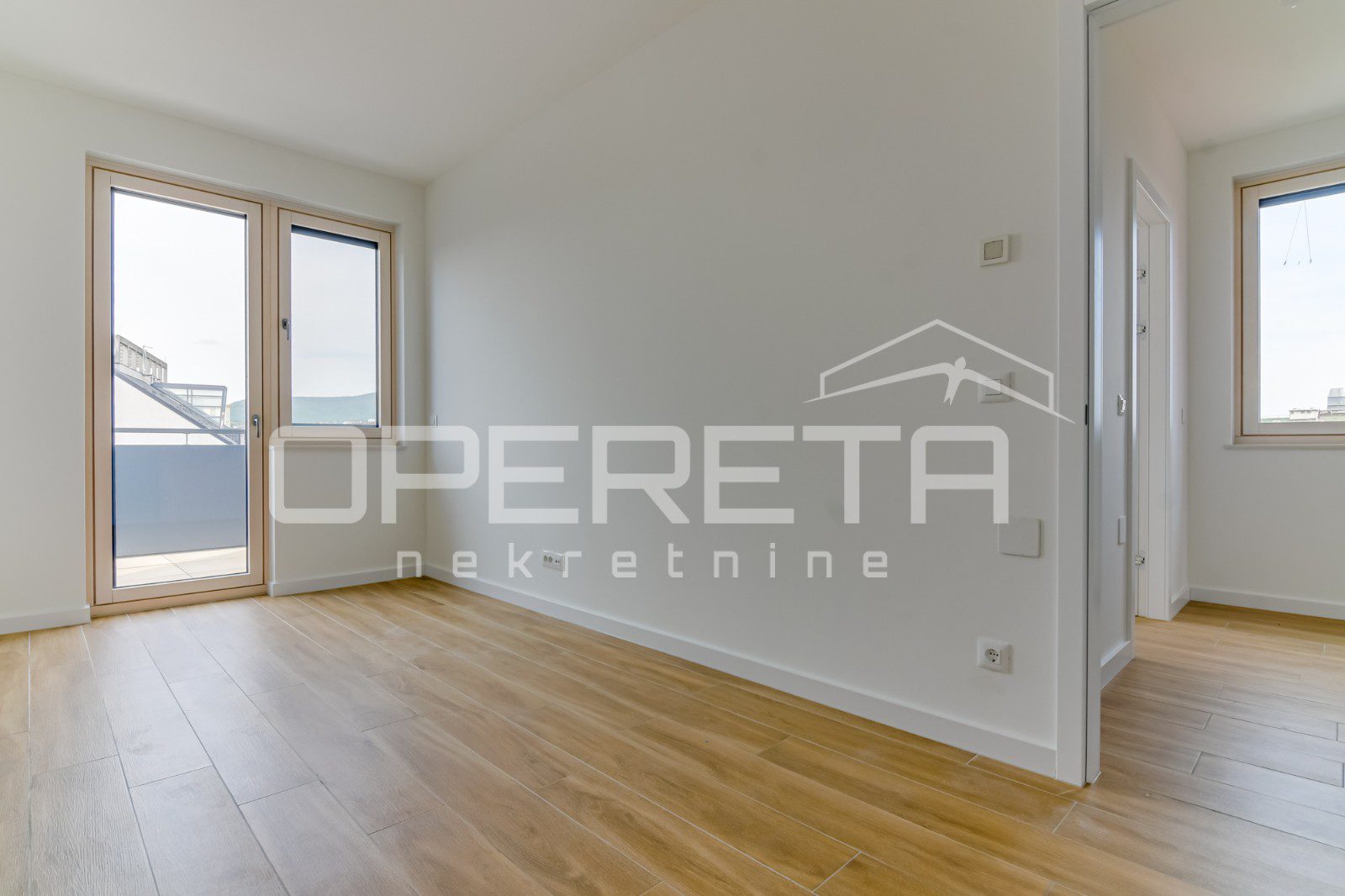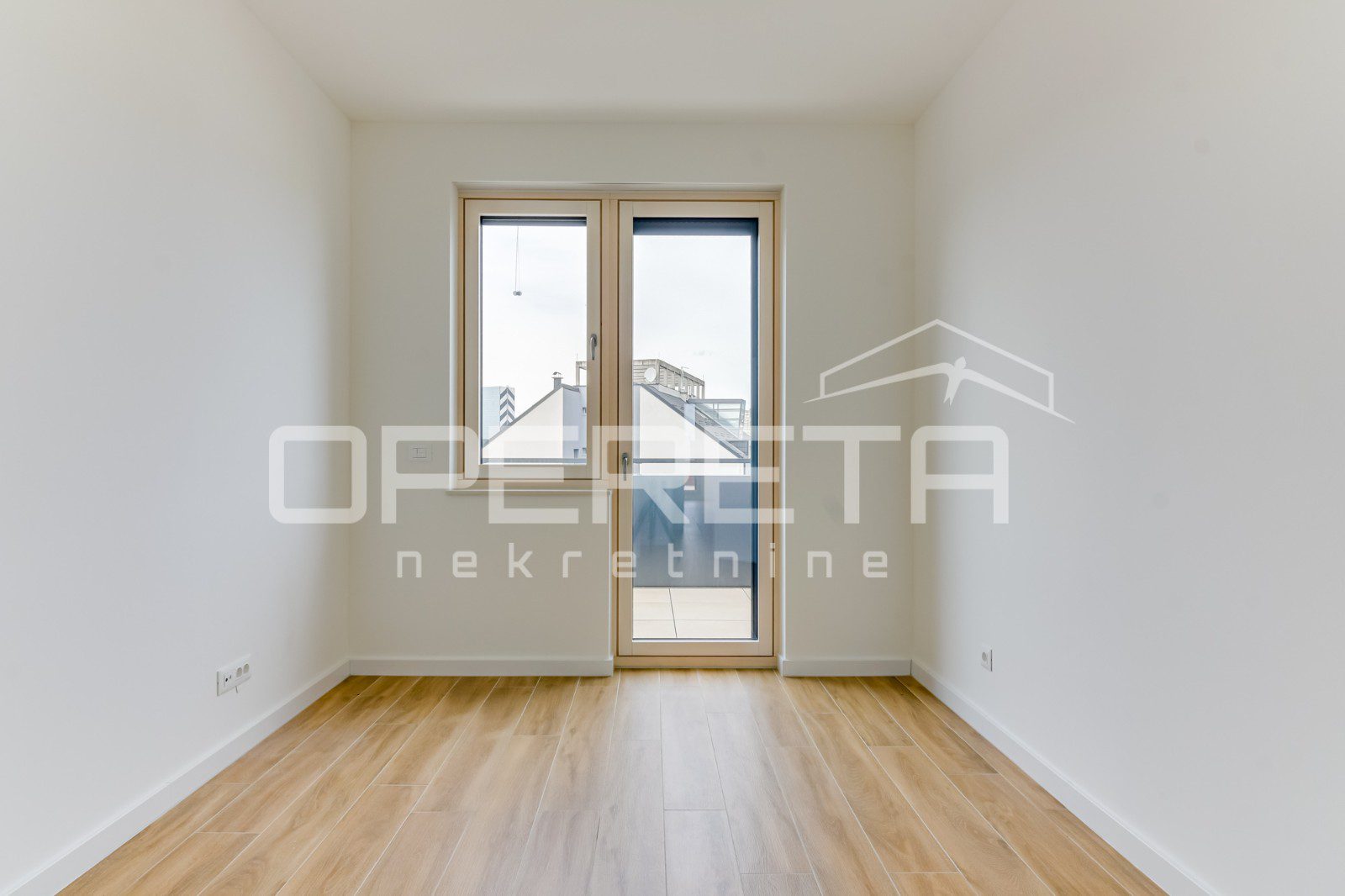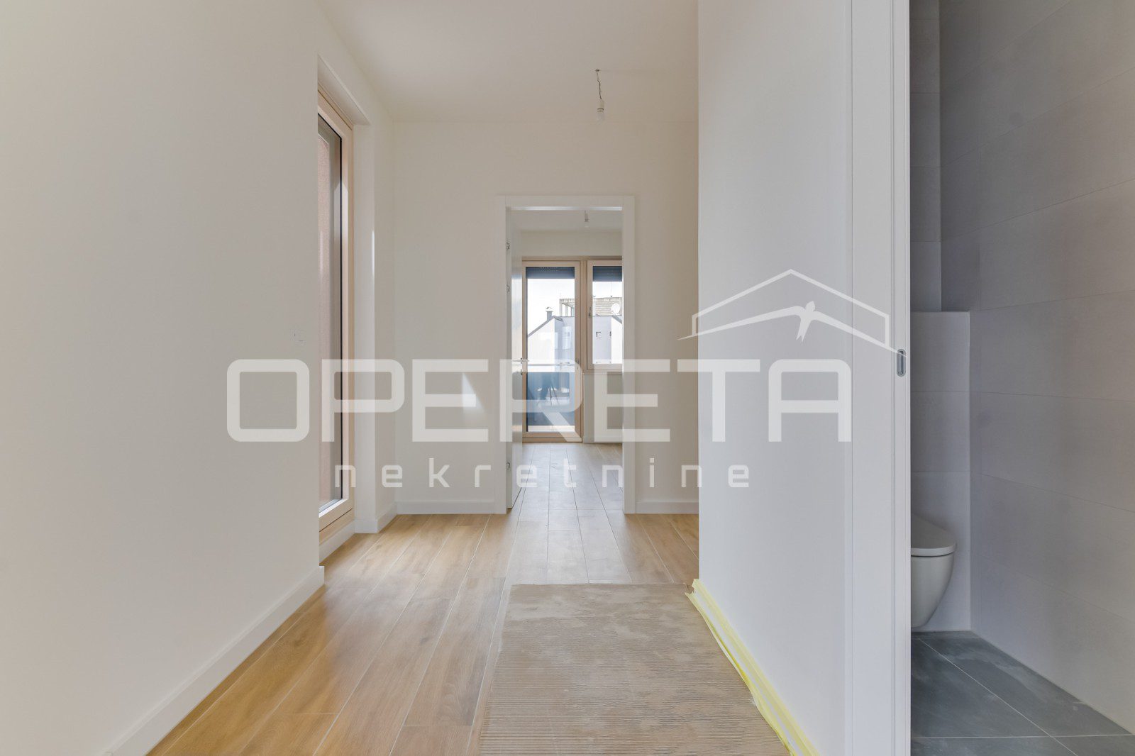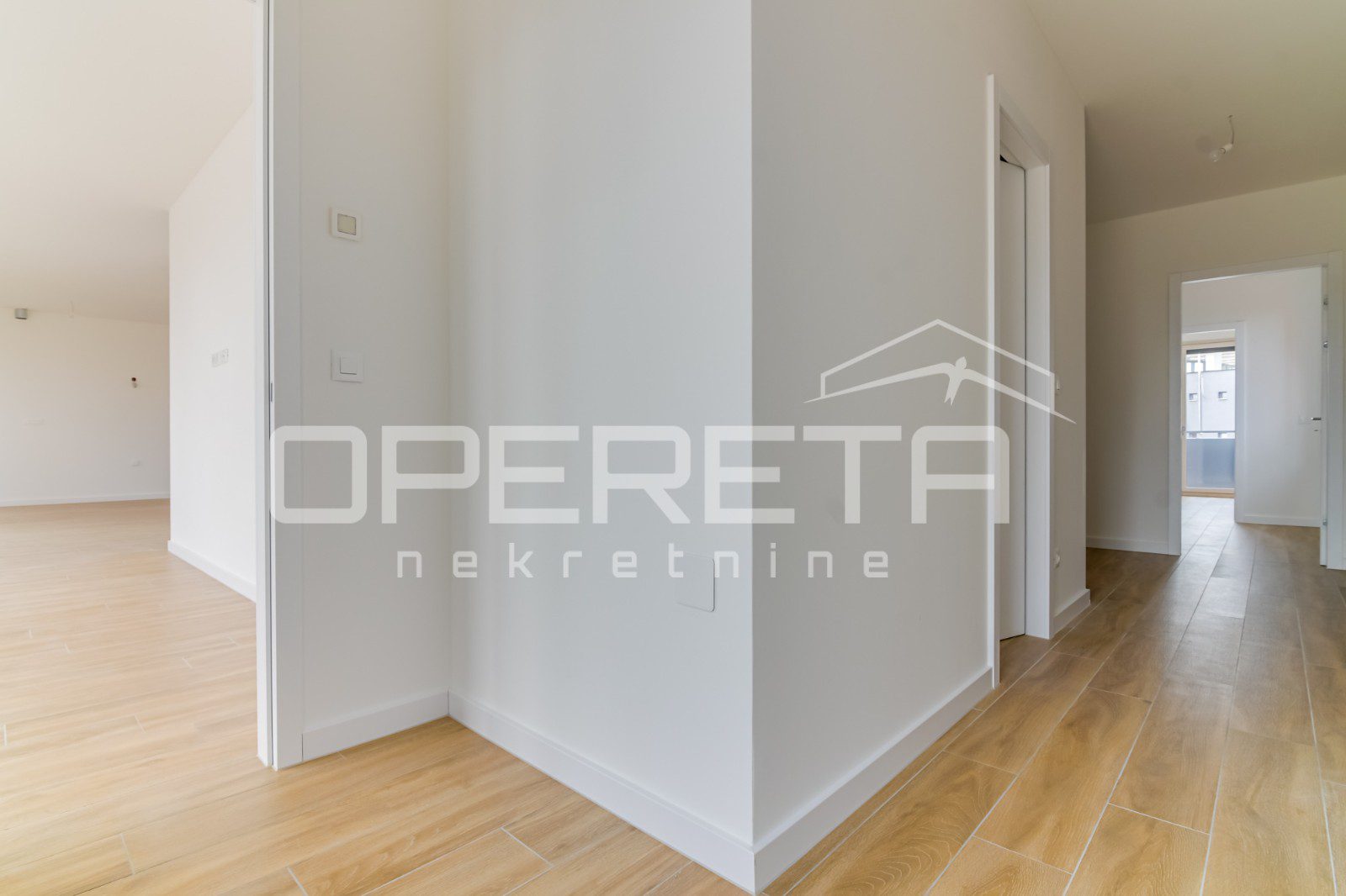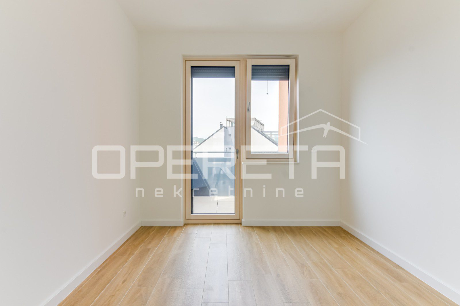 Peterosoban penthouse na 5. katu (jedini stan na cijeloj etaži) s liftom koji se sastoji od tri hodnika, 1 open space prostor s kompletnom kuhinjom + 4 spavaće sobe ,tri kupaonice ukupne podne površine 131,29 m² + natkrivena terasa površine cca 20m2 + spremište u razizemlju+ zatvorena garaža na -1, parkirno mjesto u garaži i vanjsko parkirno mjesto ( sveukupno pripadaju 3 parkinga).
