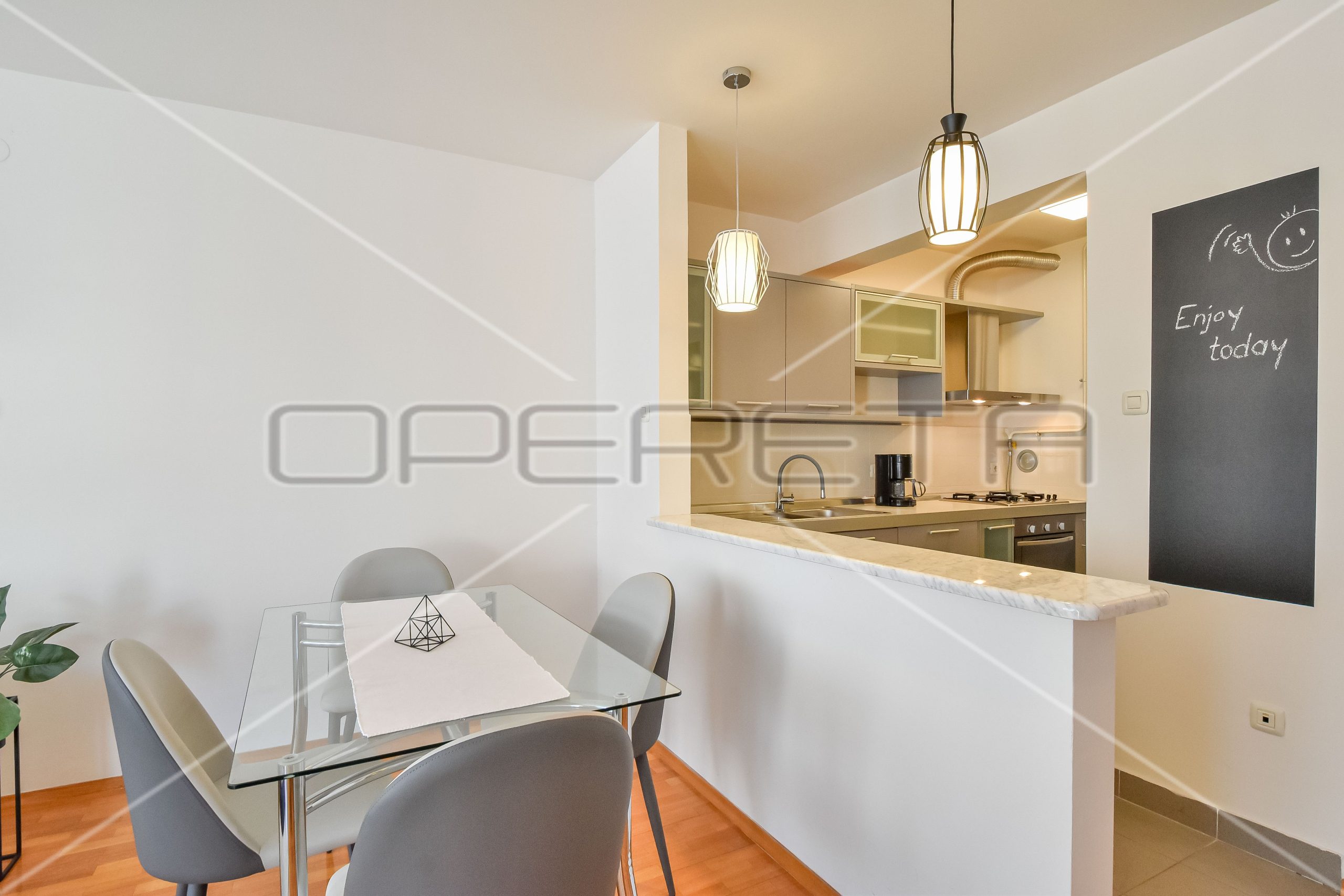 Zgrada ima lift, a garaža se nalazi na -1 etaži od 17m2 . Stan se iznajmljuje kompletno namješten i opremljen, namještaj je moderan, a sve u stanu uredno i očuvano.