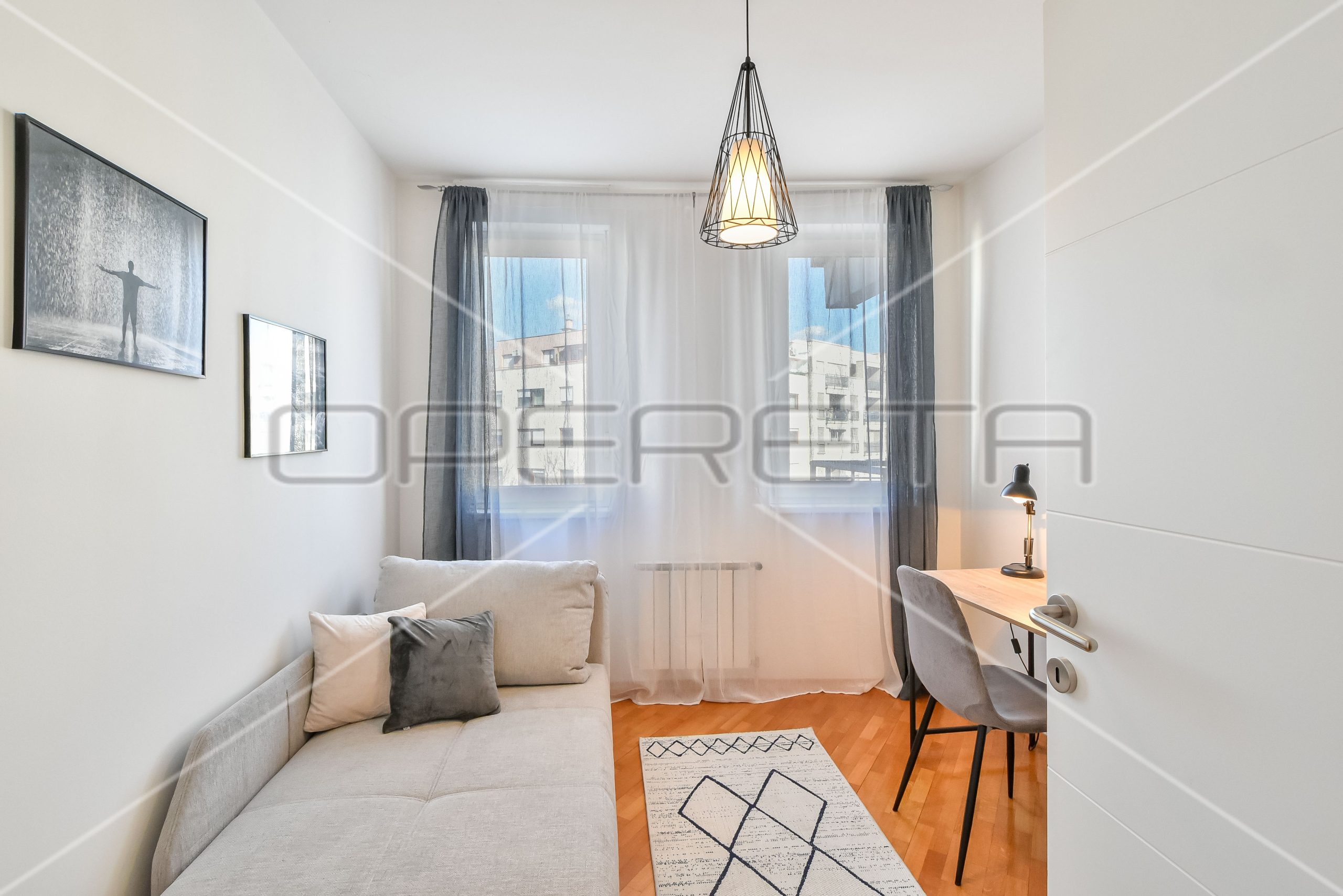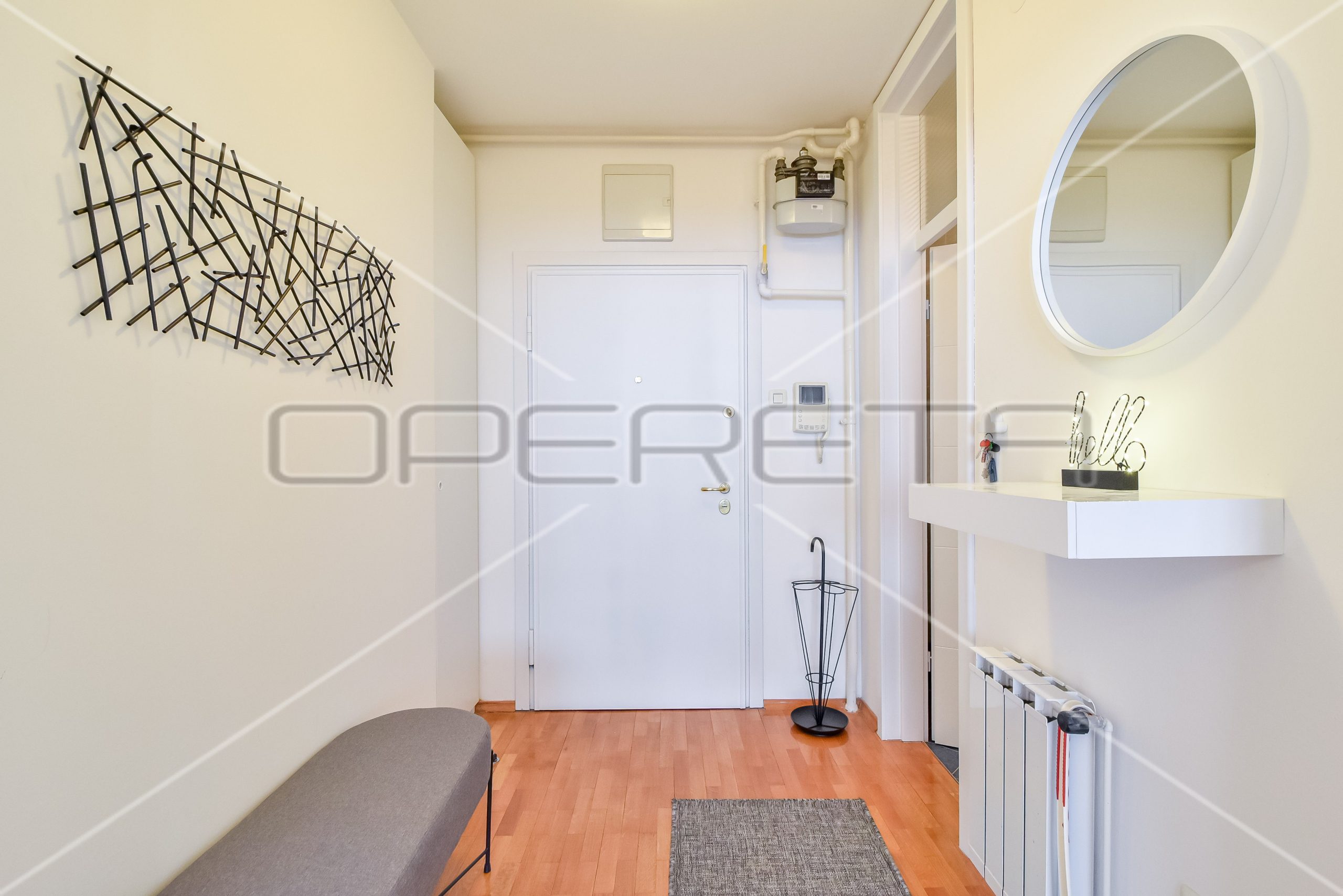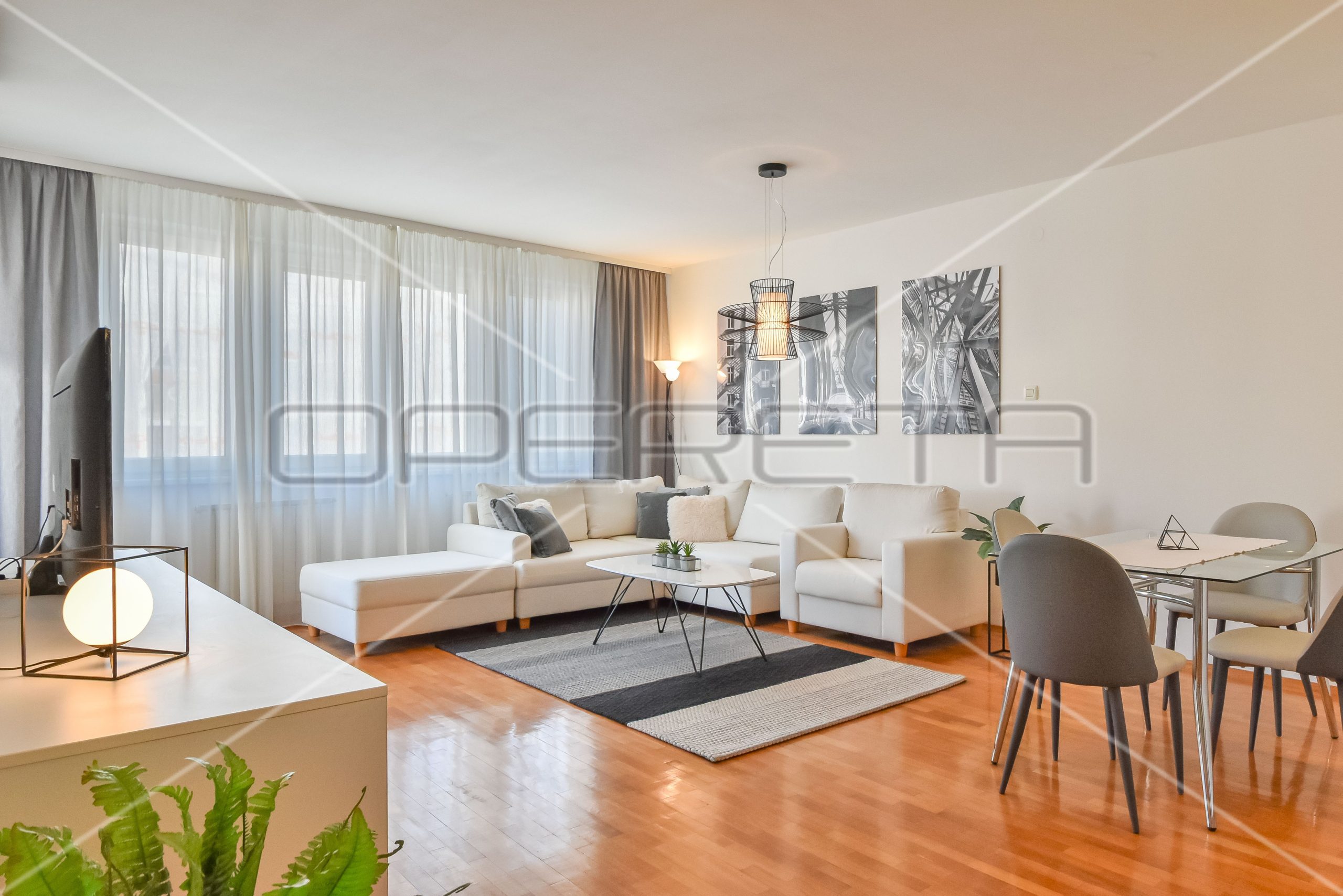 Iznajmljuje se novouređen, prostran trosoban stan, sa puno svijetlosti, smješten na odličnoj trešnjevačkoj lokaciji (blizina tramvajske stanice, dućana, drogerija, ljekarne, škole, kafića, restorana) sa vlastitim garažnim mjestom u zgradi. Stan se sastoji od ulaznog prostora, gostinjskog toaleta, dnevnog boravka sa blagovaonicom koji imaju izlaz na balkon istočno-zapadne orijentacije, kuhinje, kupaonice te dvije spavaće sobe.