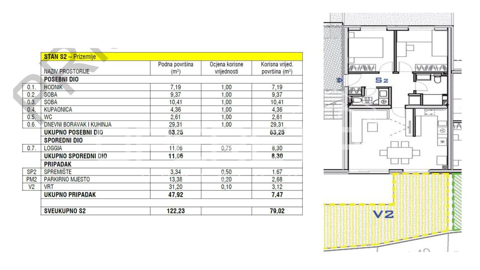 Ukupna bruto površina stana sa svim pripadcima iznosi 122 m², dok je neto korisna površina 79 m². Raspored obuhvaća ulazni hodnik (7 m²), prostrani dnevni boravak s kuhinjom i blagovaonicom (29 m²), dvije spavaće sobe (po 10 m²), kupaonicu (4 m²), dodatni WC (3 m²) te loggiu (11 m²) koja se prirodno nadovezuje na dnevni prostor.