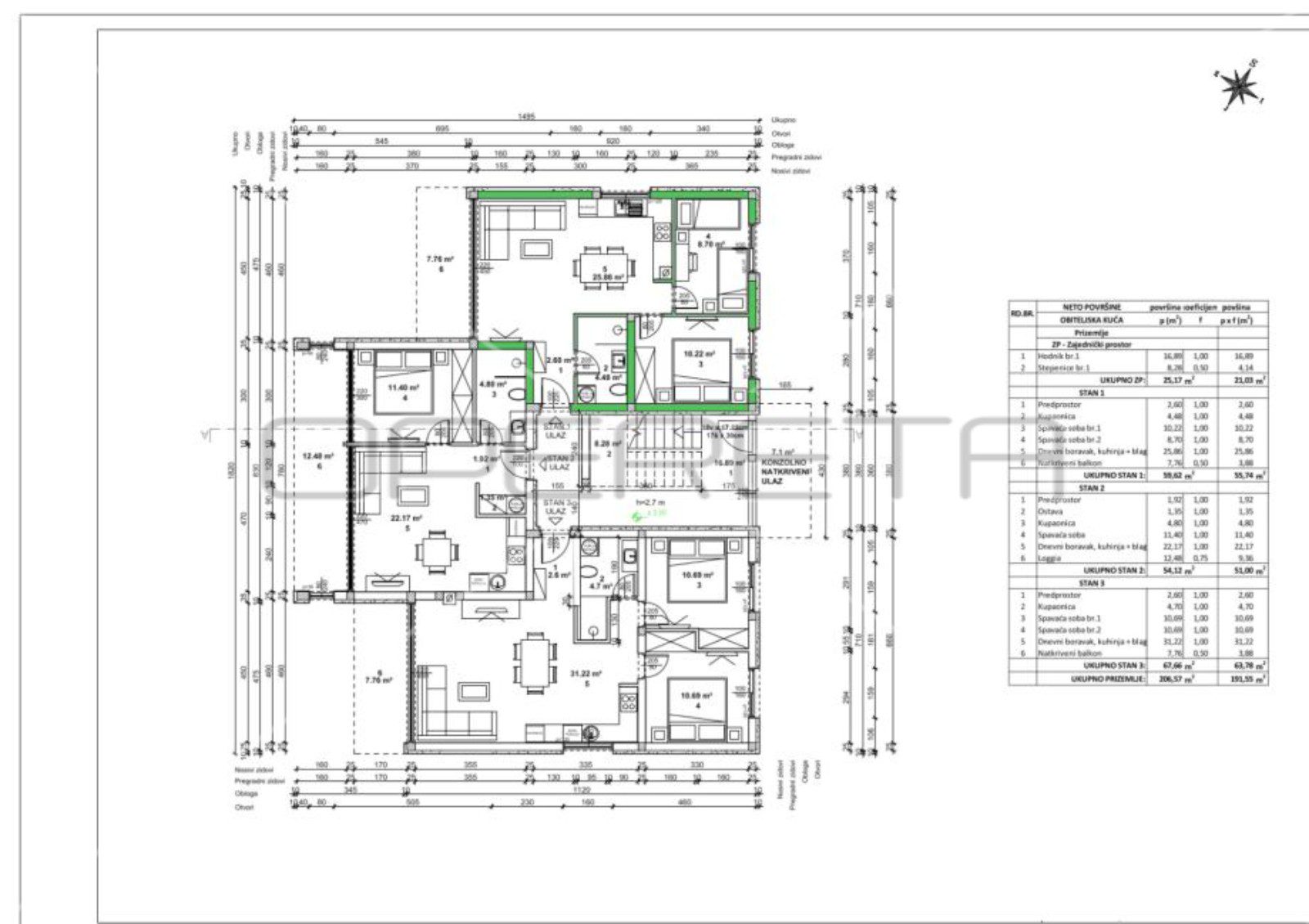 Stan S1 u prizemlju stambene je površine 67,66m2 a sastoji se od ulaznog hodnika, kuhinje s blagavaonicom i dnevnim boravkom u jednoj cjelini, kupaonice te dvije spavaće sobe. Iz dnevnog dijela stana kroz staklene stijene izlazi se na terasu te u vrt.