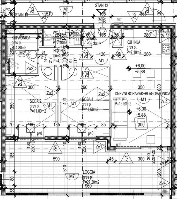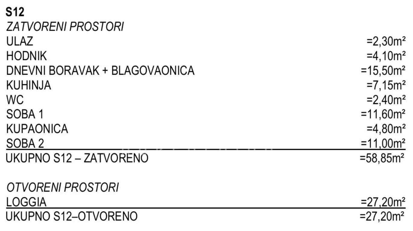 Iz ponude izdvajamo stan S12 koji se nalazi na 2. katu, a sastoji se od: ulaznog dijela, dnevnog boravka i blagavaonice, kuhinje, hodnika, 2 spavaće sobe, kupaonice, zasebnog toaleta, prostrane terase 27,20m² (koef. 0,50).