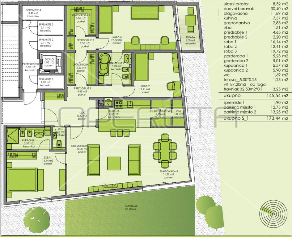 Iznajmljuje se prekrasan, iznimno prostran 4 soban stan, neto korisne površine 145m², sa dva parkirna mjesta, spremištem i velikom terasom i vrtom. Stan se nalazi na odličnoj lokaciji u rezidencijalnom naselju Srebrnjak, okružen zelenilom i mirom, a nadomak centru grada, na par minuta udaljenosti od trgovine i autobusne stanice. Stan karakterizira odlično tlocrtno rješenje, visoka kvaliteta svih korištenih materijala (hrastov parket, keramika) te pregršt dodatnih sadržaja (hidromasažna kada, biometrijska protuprovalna brava, ambijentalna rasvjeta, alarmni sustavi, podno grijanje). Stan se sastoji od ulaznog halla, ogromnog dnevnog boravka sa kuhinjom i pripadajućom smočnicom, kupaonice, WC-a, prekrasne, velike loggie te tri spavaće sobe.