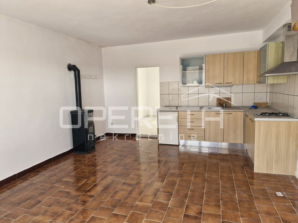 Ulaz vodi u prostrani otvoreni prostor koji povezuje dnevni boravak, kuhinju i blagovaonicu u skladnu i svijetlu cjelinu, obasjanu prirodnim svjetlom zahvaljujući dobroj orijentaciji i većim otvorima. Iz ovog dijela stana pristupa se spavaćoj sobi, iz koje se izlazi na terasu smještenu na stražnjoj strani kuće. Terasa pruža ugodan kutak za opuštanje i boravak na otvorenom, s pogledom na vrt i zelenilo koje okružuje objekt.