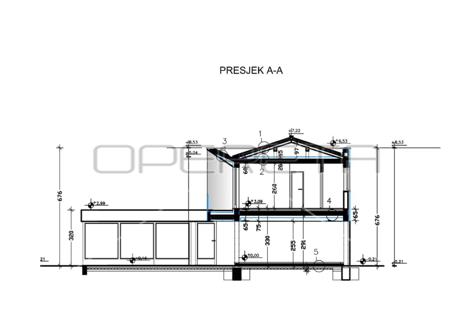 Uz zemljište dolazi i projekt za prekrasnu kuću za odmor na dvije etaže i neto površine 236,42m2 (korisne 188,85m2). Kuća je dizajnirana s pažnjom na udobnost i funkcionalnost, te uključuje: