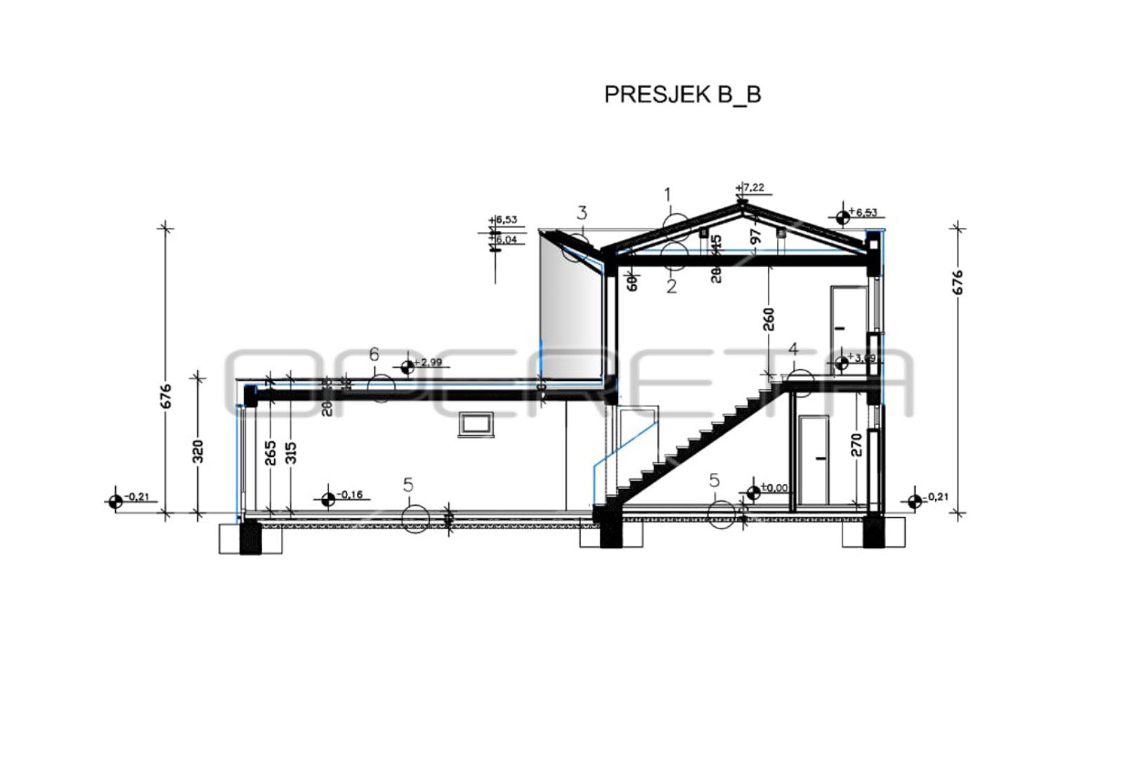 Uz zemljište dolazi i projekt za prekrasnu kuću za odmor na dvije etaže i neto površine 236,42m2 (korisne 188,85m2). Kuća je dizajnirana s pažnjom na udobnost i funkcionalnost, te uključuje: