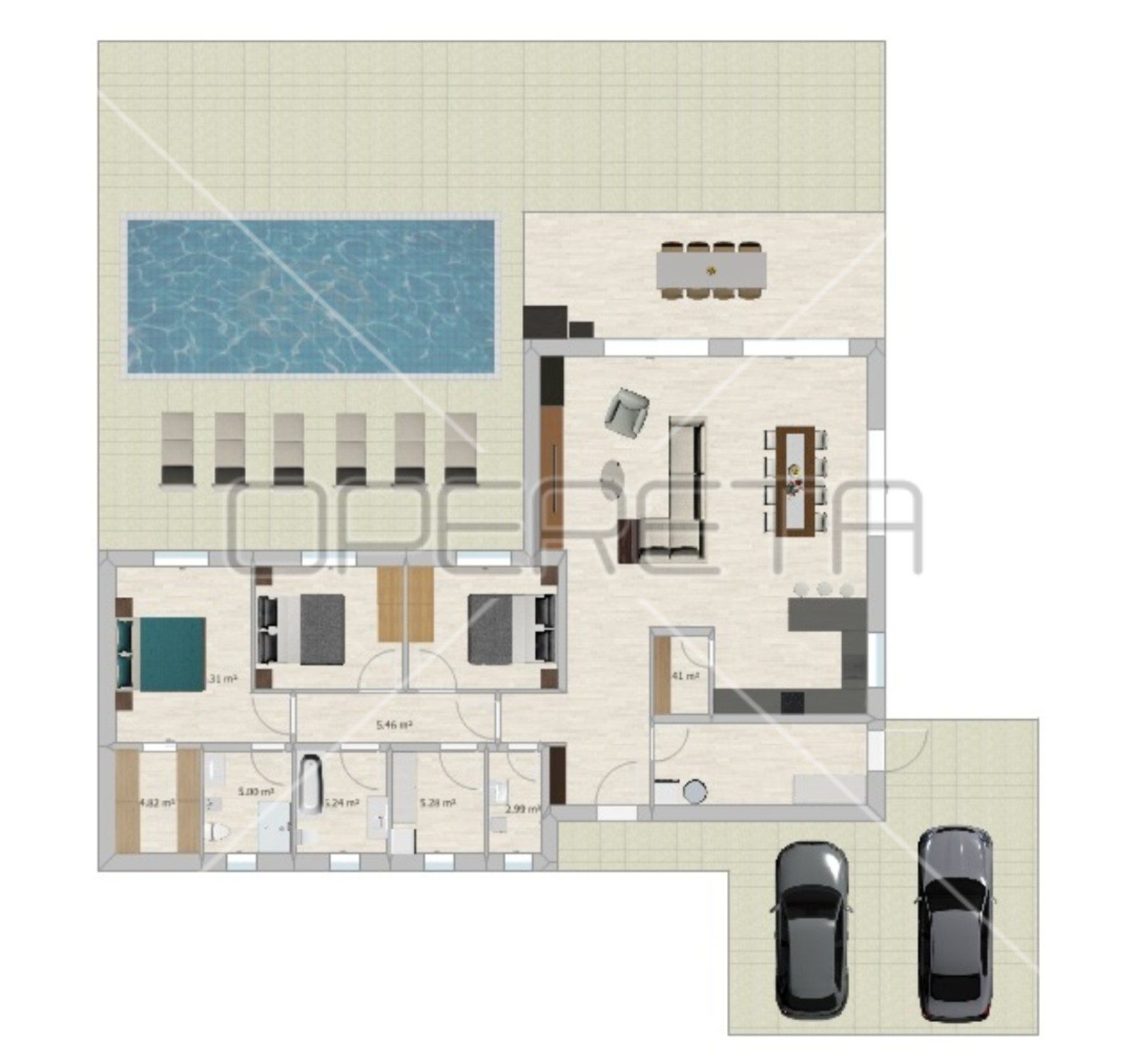 Građevinska dozvola ishodovana je za prizemnicu s bazenom od 252 m2 bruto površine.