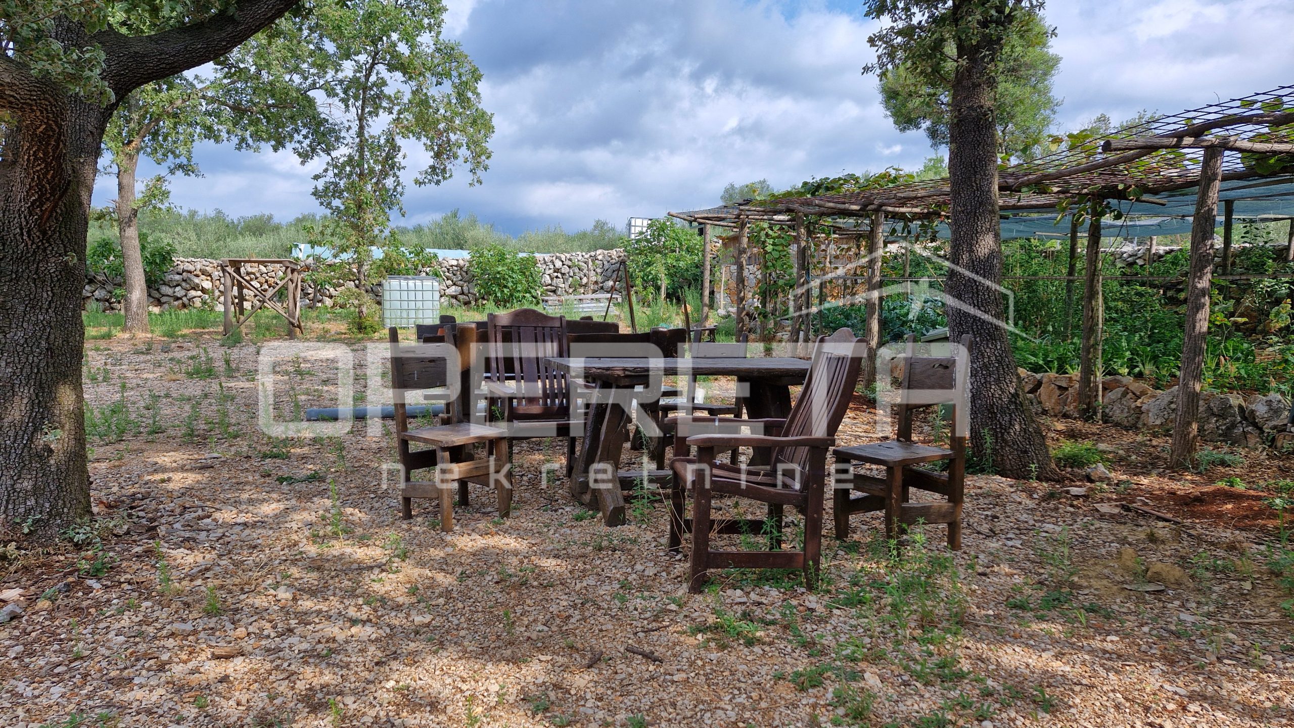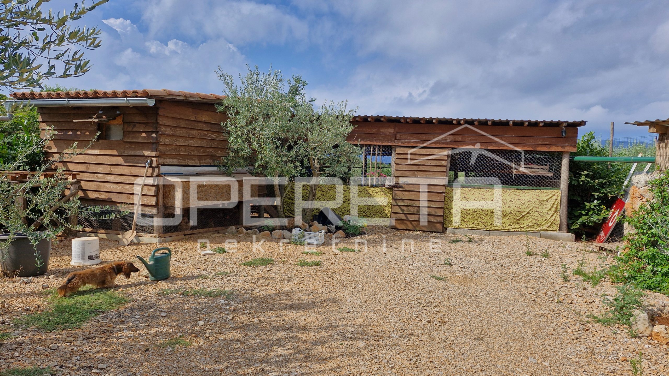 Maslinik ima dva ulaza za vozila s metalnim kapijama, veliku nadstrešnicu (60 m²), manju nadstrešnicu (30 m²) i natkriveni vrt (8×18 m) u funkciji. Uz to, postoji natkriveno spremište (16×6 m) i iskopana rupa za šternu, koja omogućava dodatno skladištenje vode. Na parceli se nalaze i solarni paneli (8 komada), koji još nisu postavljeni, a ima i kapiju od prirodnih materijala te široki kolnički ulaz.