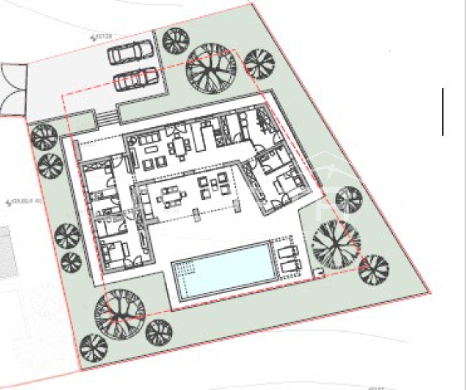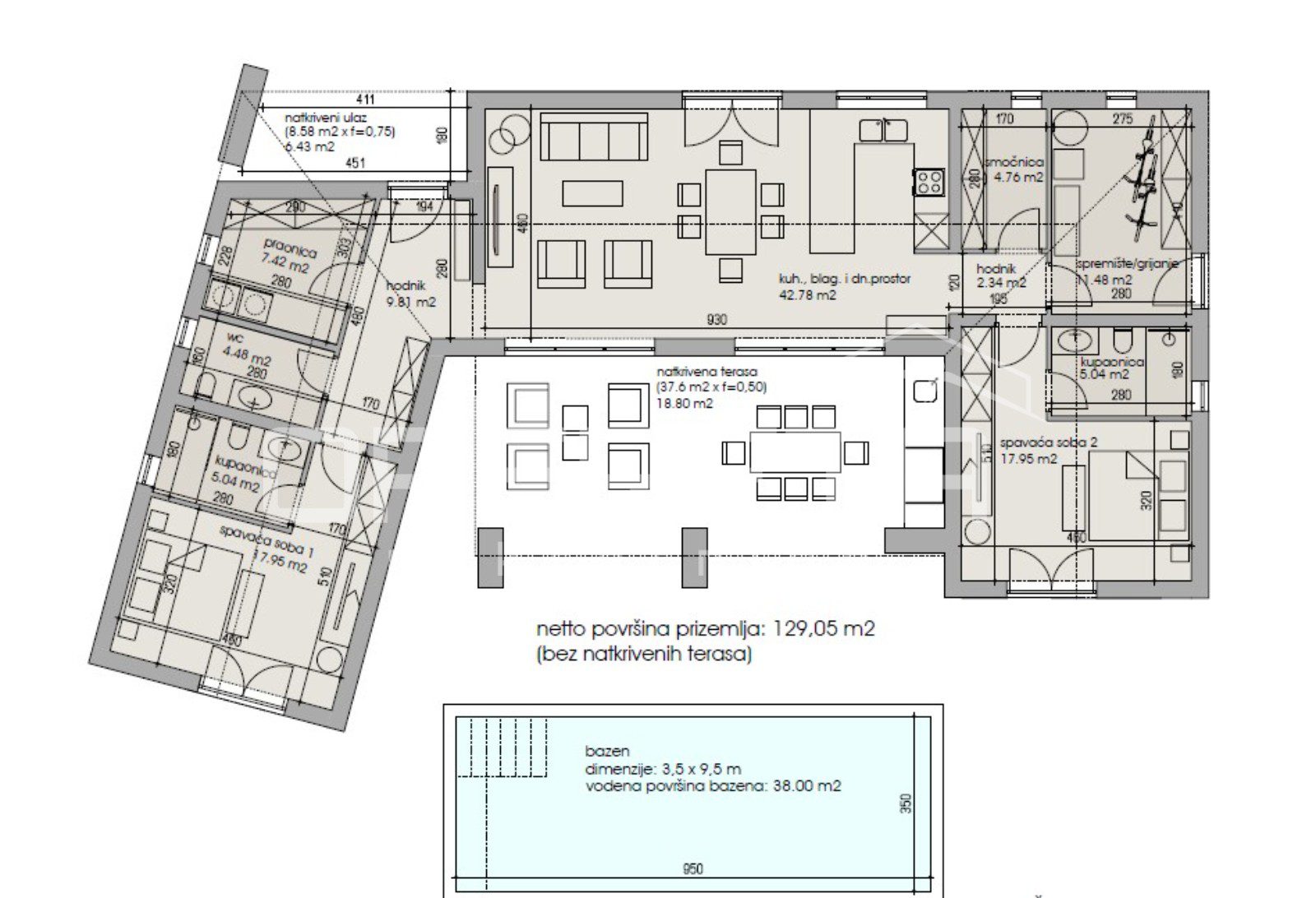 Za parcelu je već izrađeno idejno rješenje za modernu prizemnicu površine 129 m² te pripadajući bazen od 38 m²,