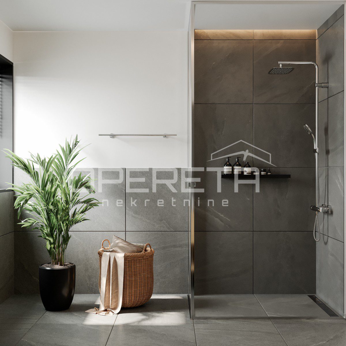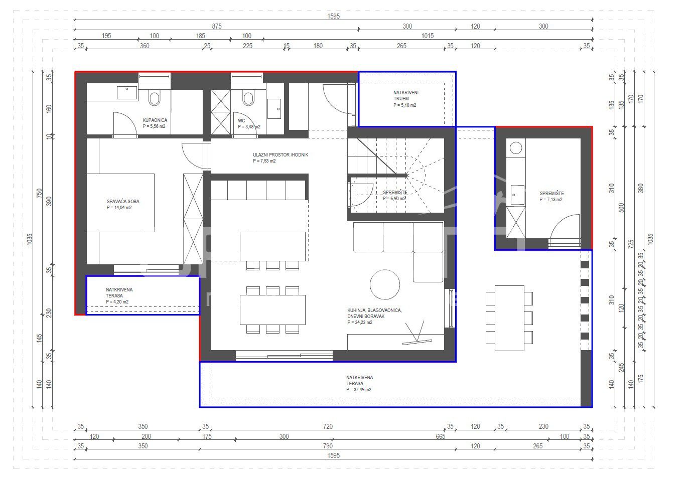 Tlocrtno, prizemlje kuće sastoji se od otvorenog dnevnog boravka s kuhinjom i blagovaonicom, jedne spavaće sobe s vlastitom kupaonicom, gostinjskog toaleta te dvije natkrivene terase, od kojih jedna ima površinu veću od 37 m². U sklopu dvorišta predviđen je i pomoćni objekt koji može služiti kao spremište ili ljetna kuhinja. Na katu su smještene dvije prostrane spavaće sobe, kupaonice, natkrivena lođa i terasa ukupne površine preko 25 m².
