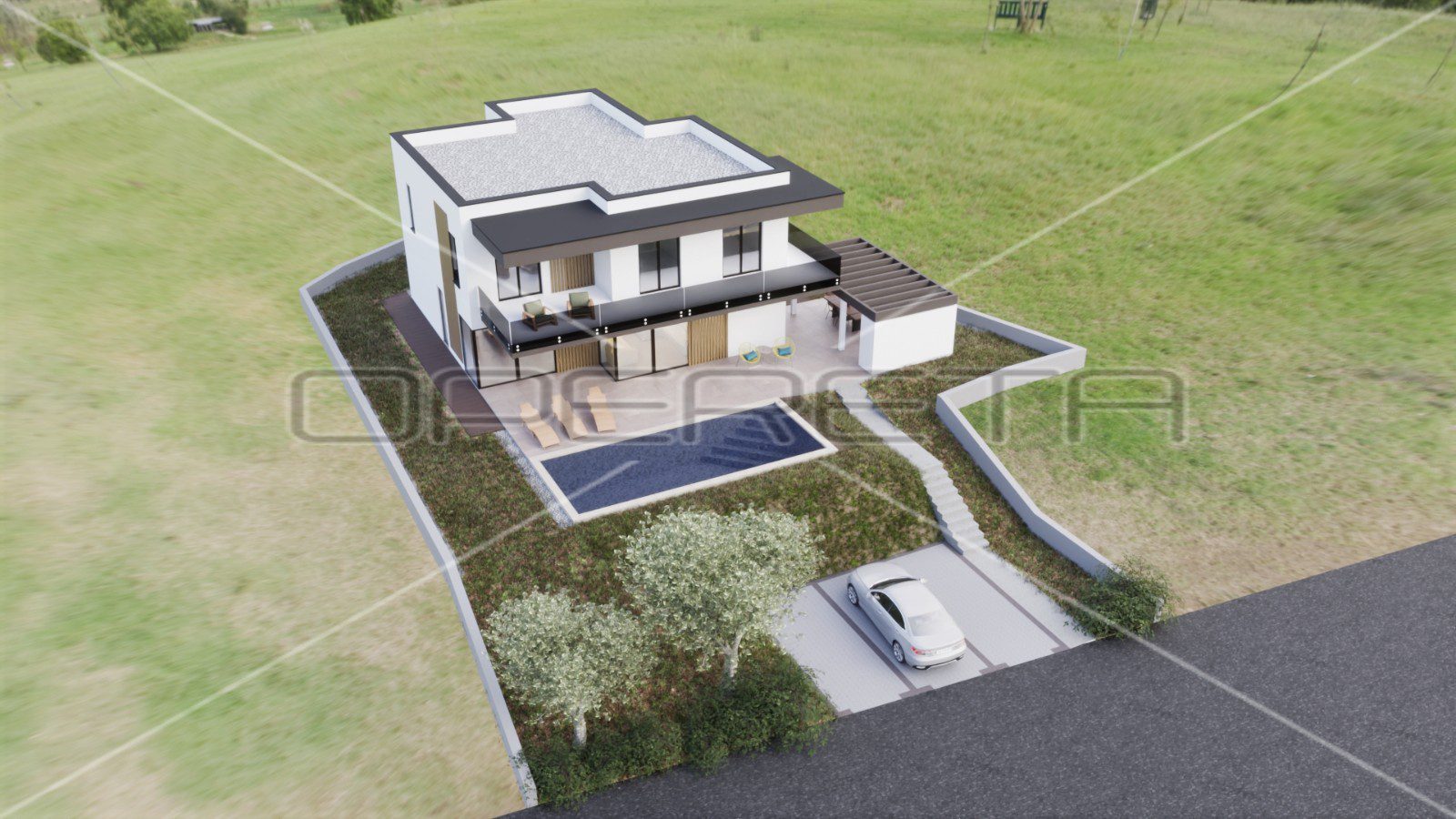 Za zemljište se razvio idejni projekt za modernu kuću s pomoćnim objektom koji služi kao vanjska kuhinja, s bazenom i parkiralištem za 3 automobila.