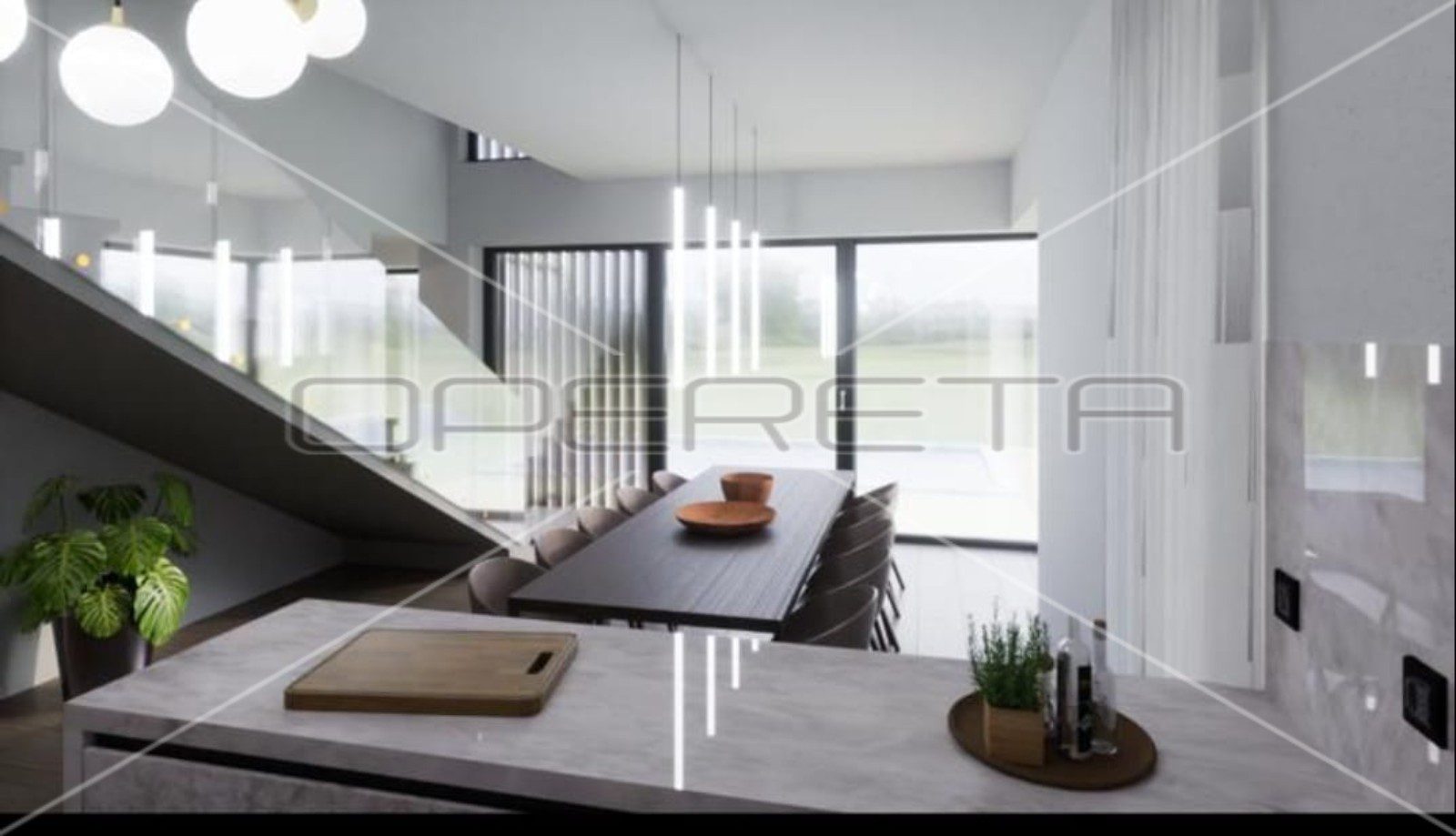 Kuća se proteže kroz dvije etaže, gdje je prizemna etaža zamišljena kao dnevni dio, tj. dnevni boravak, kuhinja s blagovaonicom, teretana sa saunom i kupaonicom, dodatni toalet i praonica/ostava. Na gornjoj etaži smještene su četiri spavaće sobe, tri kupaonice i prostrani natkriveni balkon od 30 m2 koji nudi zadivljujuće poglede.