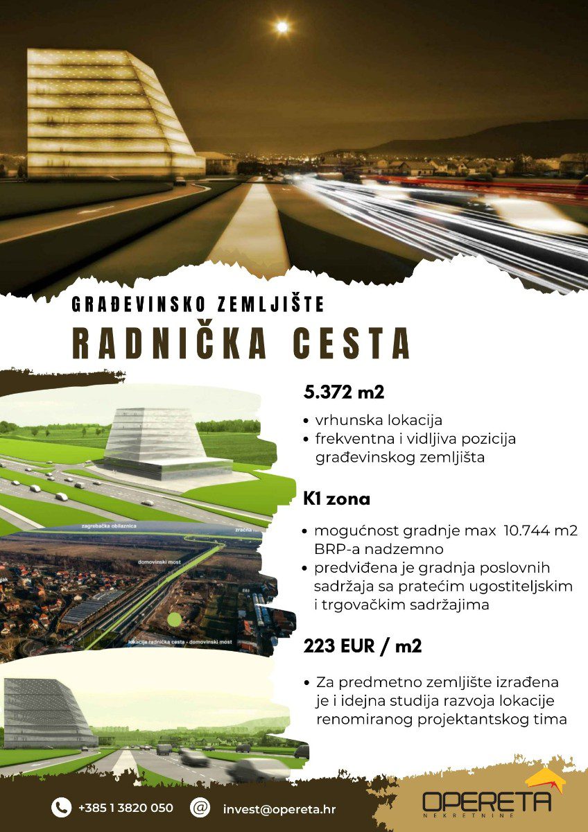 Prodaje se građevinsko zemljište na izuzetno frekventnoj i vidljivoj lokaciji. Zemljište je ukupne površine 5.372 m2. Svojom dužom stranicom od cca 80 m graniči sa Radničkom cestom i među prvima je parcelama sa dozvoljenom gradnjom na lijevoj obali Save kada se dolazi iz smjera zračne luke.