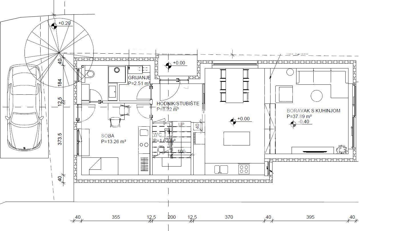 Prema projektu, u prizemlju su predviđeni hodnik, stubište, jedna spavaća soba s kupaonicom, dodatni wc, tehnička prostorija te dnevni boravak s kuhinjom i blagovaonicom s izlazom na vrt. Na katu se nalaze dvije spavaće sobe, kupaonica, hodnik s ugradbenim ormarima, vešeraj i terasa. Ako je potrebno, umjesto vešeraja može se dobiti i četvrta spavaća soba.