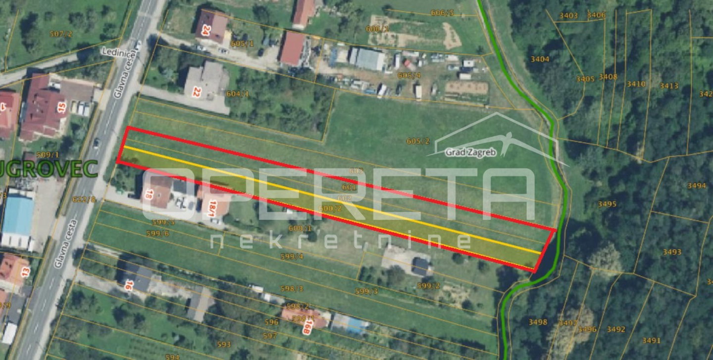 Zemljište se sastoji od tri povezane parcele, s oko 1200 m² u građevinskoj zoni uz cestu, dok ostatak pripada poljoprivrednoj zoni. Svi potrebni priključci, uključujući plin, nalaze se na cesti uz parcelu. Širina parcele uz cestu je 15 m.