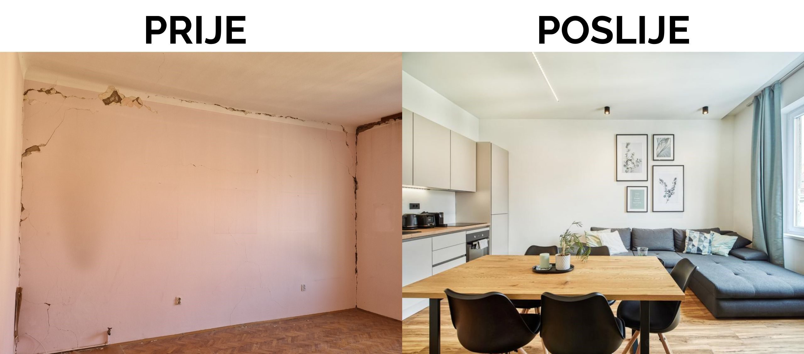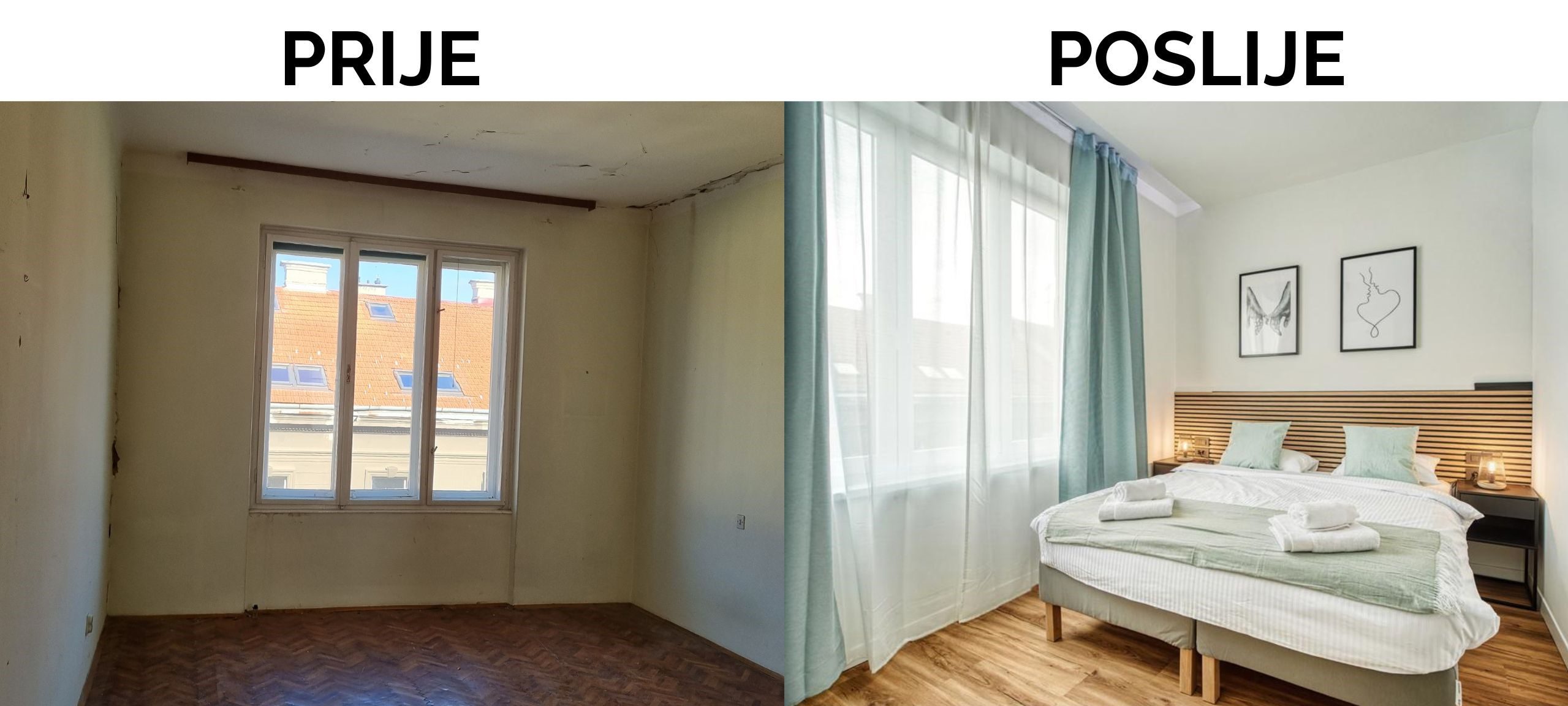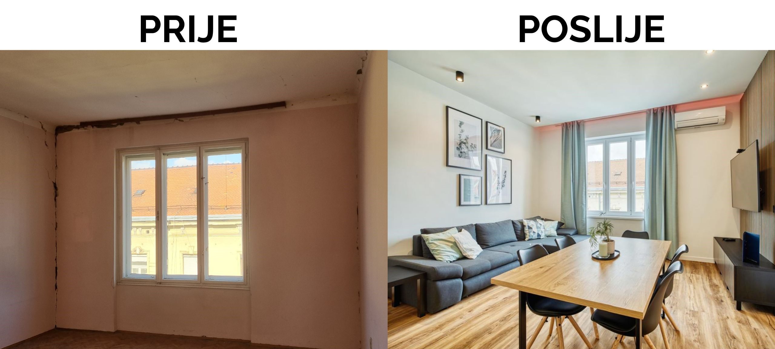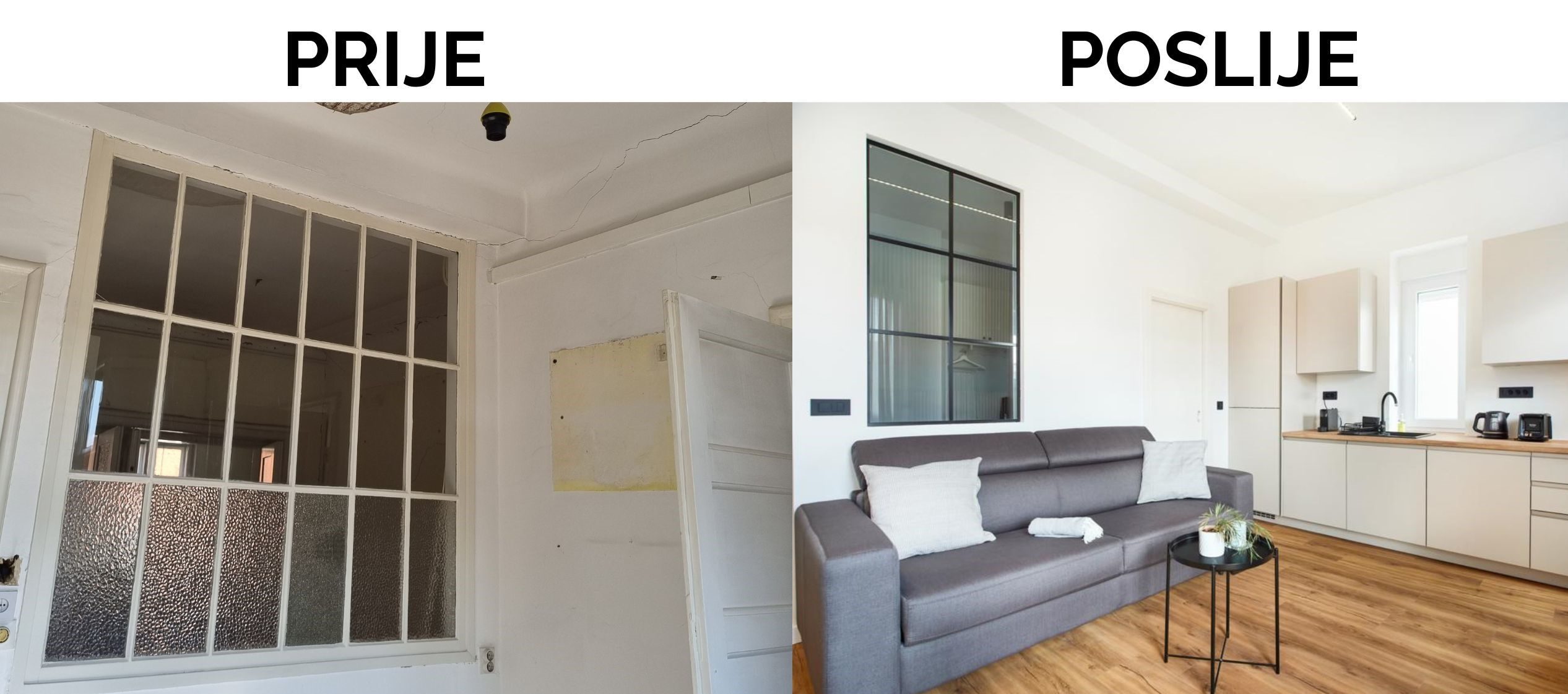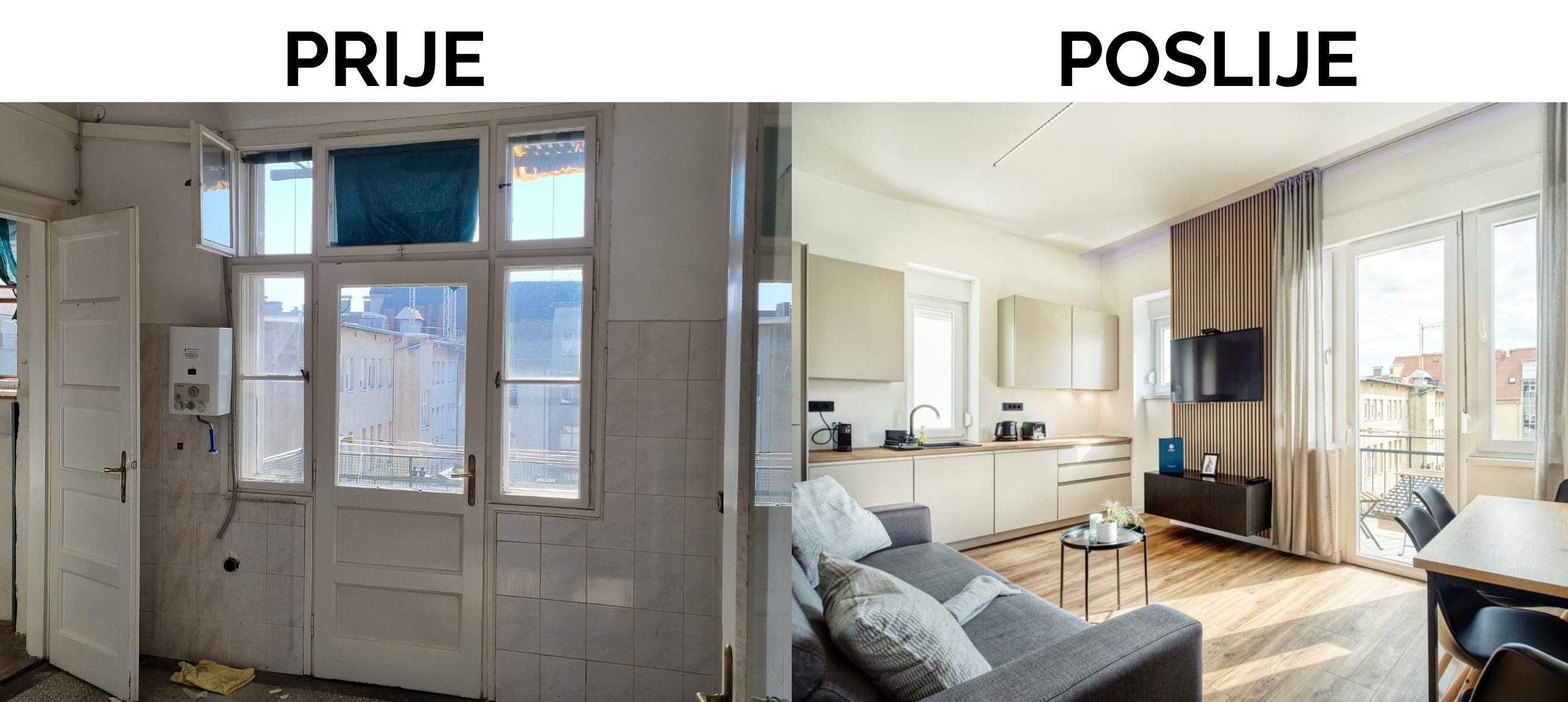 Odlučili smo Vam predstaviti preobrazbu starog, nefunkcionalnog stana u dva sjajna stana za kratkoročni najam. Stan od 90 m² u centru grada trostrano je orijentiran i u originalu trosoban. Sastojao se od dvije velike sobe, prolaznog salona, kupaonice, kuhinje, izbe i ostave.