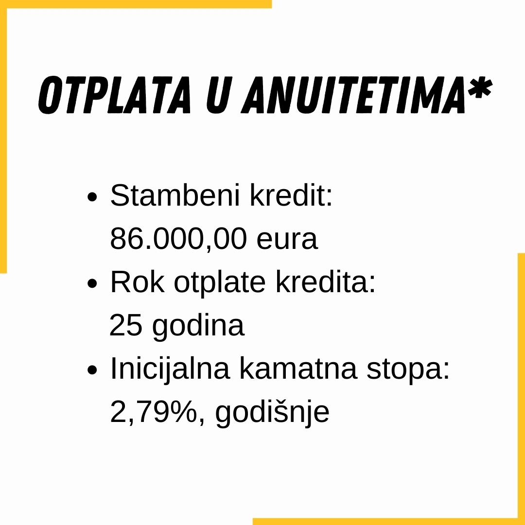 *Navedeni primjer ne predstavlja ponudu. Za informaciju o kreditnoj sposobnosti sagledava se više elemenata (npr. visina redovnog primanja, status zaposlenja, redovitost izvršavanja postojećih obveza), uz individualni pristup klijentu.