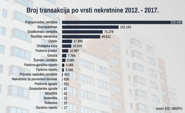 Zanimljivo je da je najveći broj kupoprodaja realiziran s poljoprivrednim zemljištem, ukupno 220.459, a tek onda slijede stanovi i apartmani koji su ostvarili ukupno 103.193 transakcije te građevinsko zemljište sa 74.378 transakcija. Ukupna vrijednost transakcija u 2012. godini iznosila je 22,4 milijarde kuna, a u 2017. porasla je na 27,8 milijardi kuna.