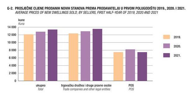 Prosječna cijena četvornog metra novog stana u prvom polugodištu – u što nisu uračunati POS stanovi – iznosila je 15.550 kuna. To je rast od 5,8 posto u odnosu na drugo polugodište 2020. godine. Što se tiče POS stanova, njihova prosječna cijena je iznosila 7.499 kuna.